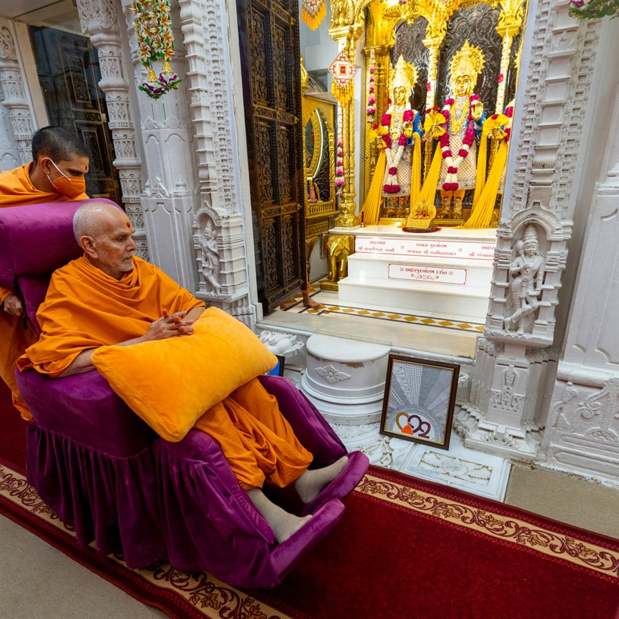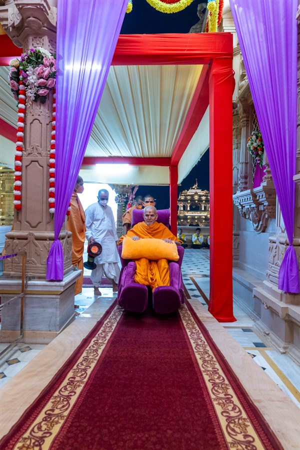 Swamishri arrives for Thakorji's darshan