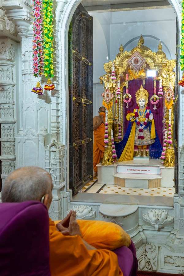 Swamishri engrossed in darshan of Shri Ghanshyam Maharaj