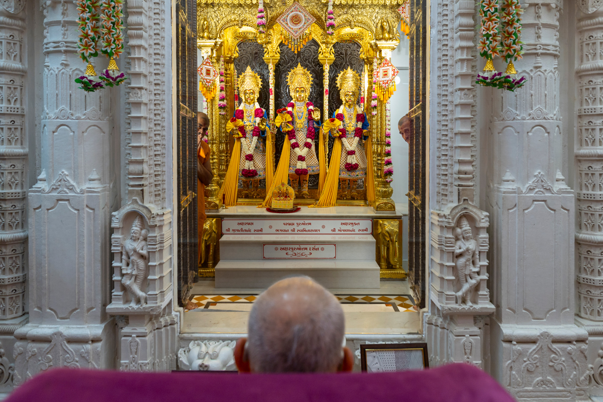 Swamishri engrossed in darshan of Bhagwan Swaminarayan, Aksharbrahma Gunatitanand Swami and Shri Gopalanand Swami