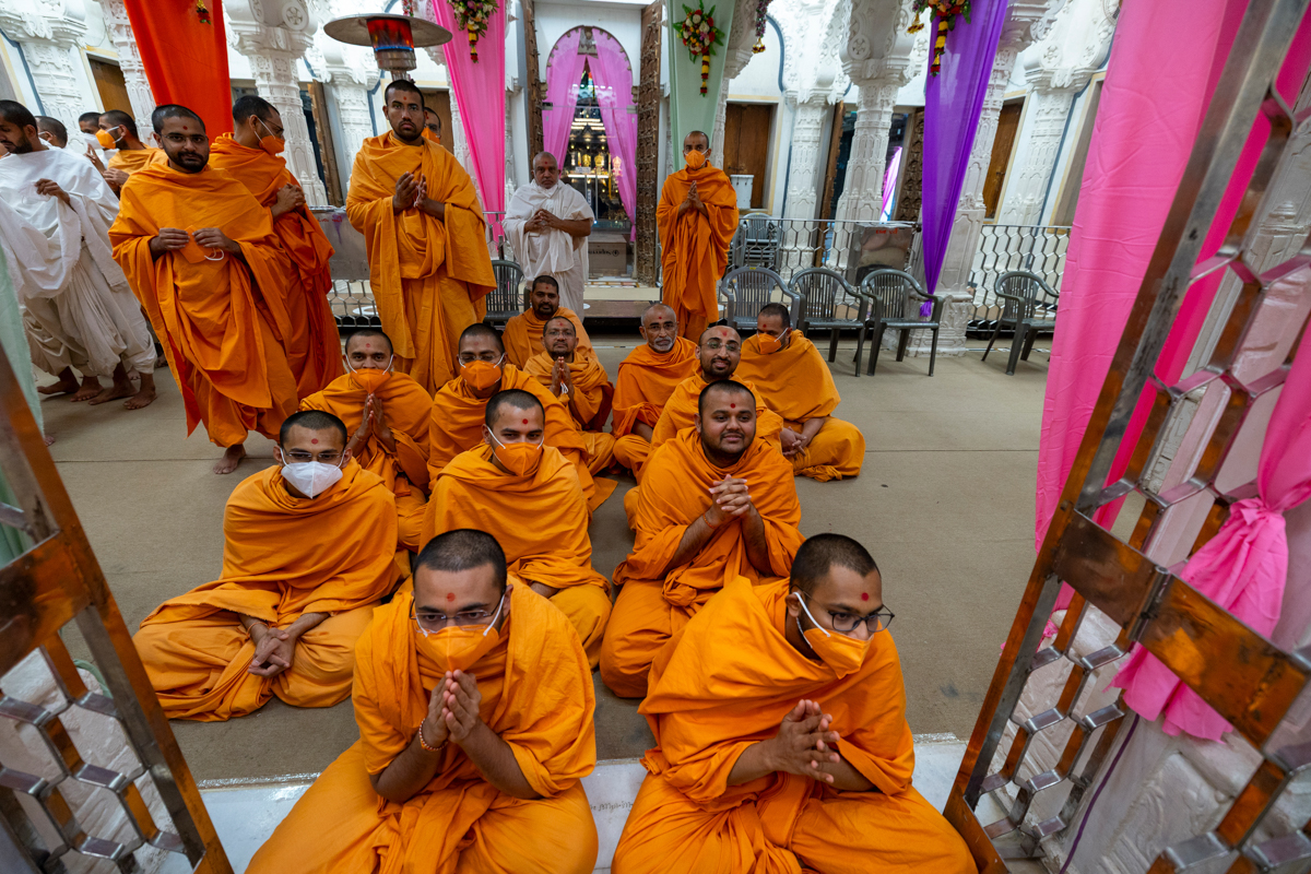 Swamis and devotees doing Swamishri's puja darshan