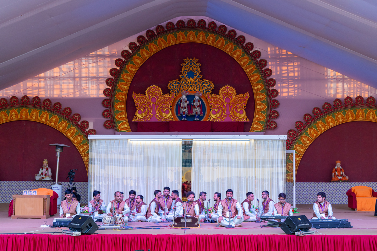 Yuvaks sing kirtans at the beginning of the evening 'Swagat Din' assembly