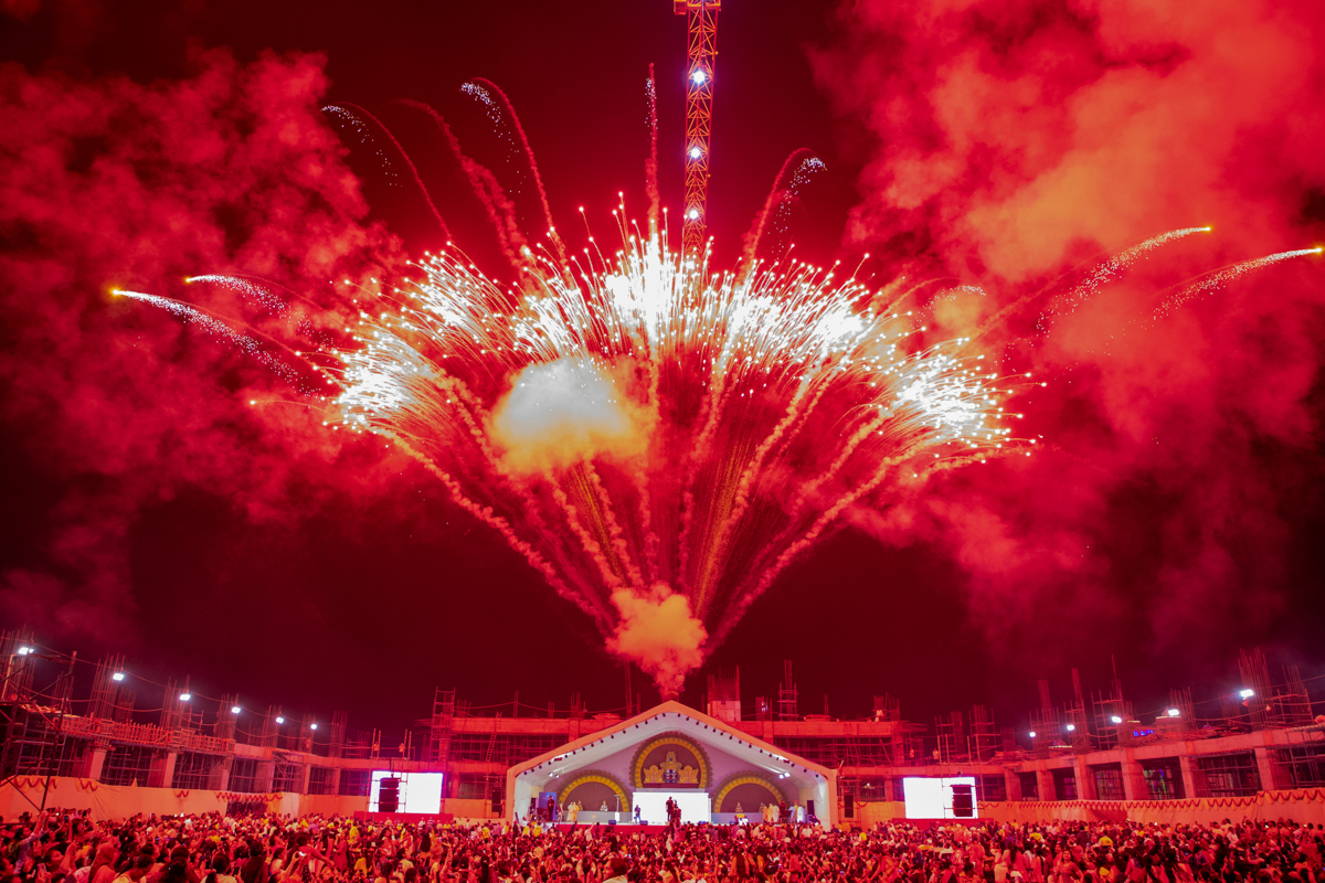 Devotees wave flags during the assembly