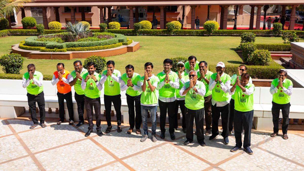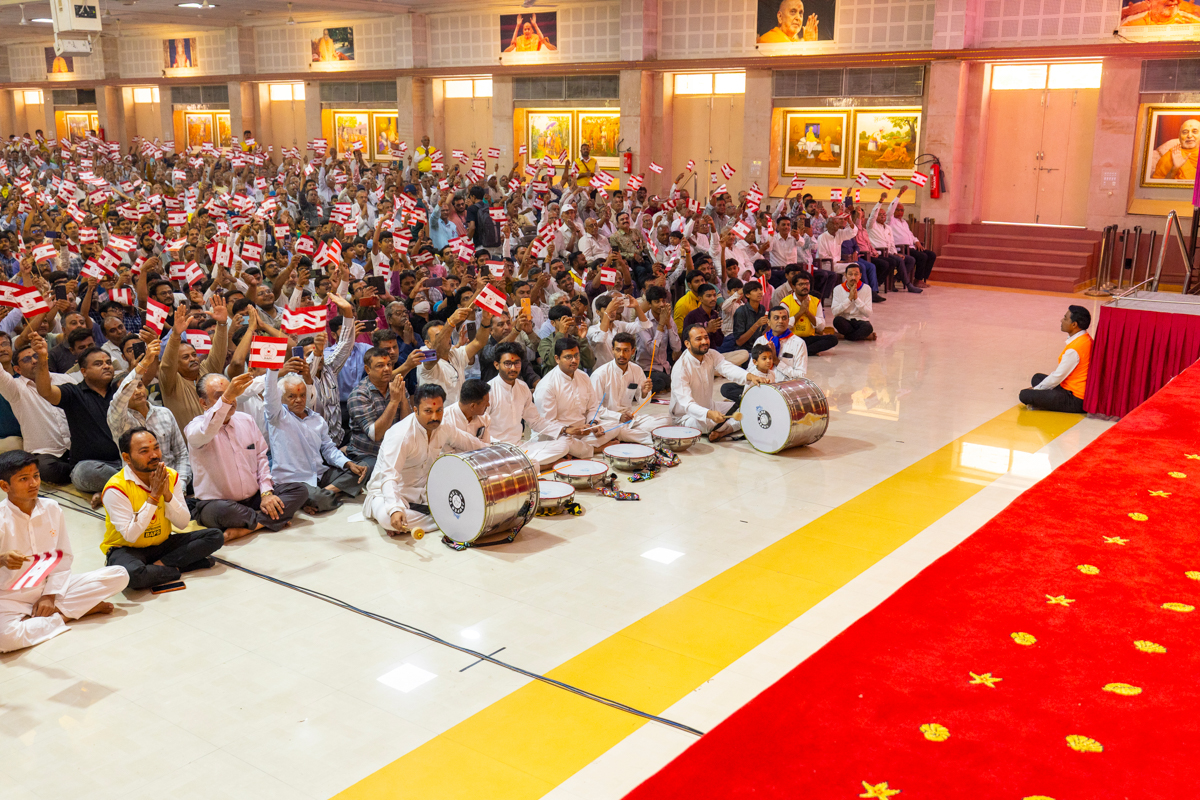 Devotees wave BAPS flags to welcome Swamishri