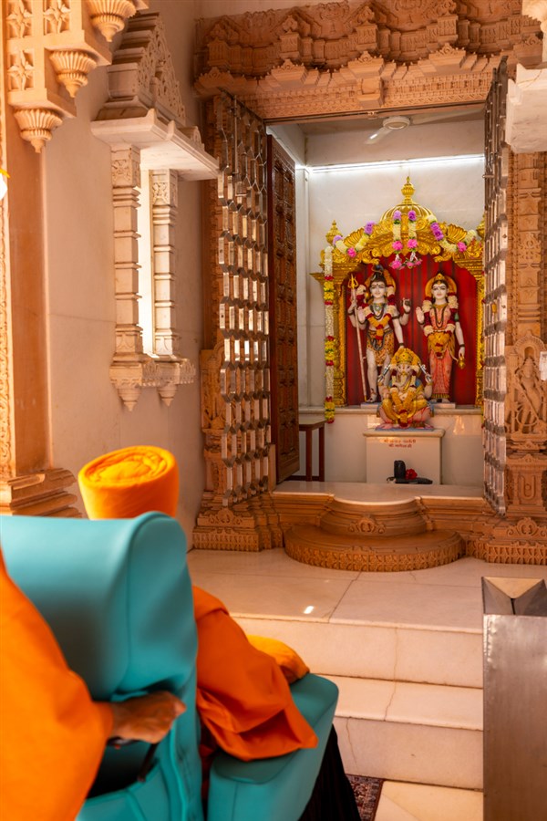 Swamishri engrossed in darshan of Bhagwan Shri Shankar, Shri Parvatiji and Shri Ganeshji