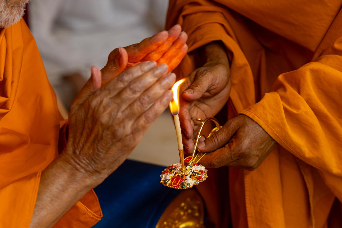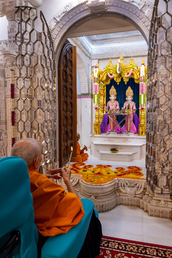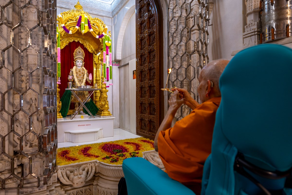 Swamishri performs the rajbhog arti in the late morning