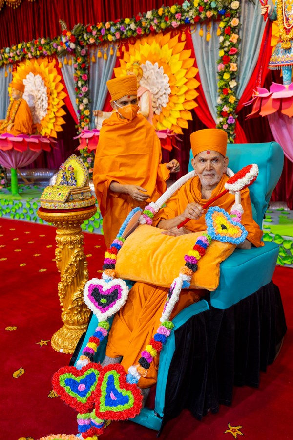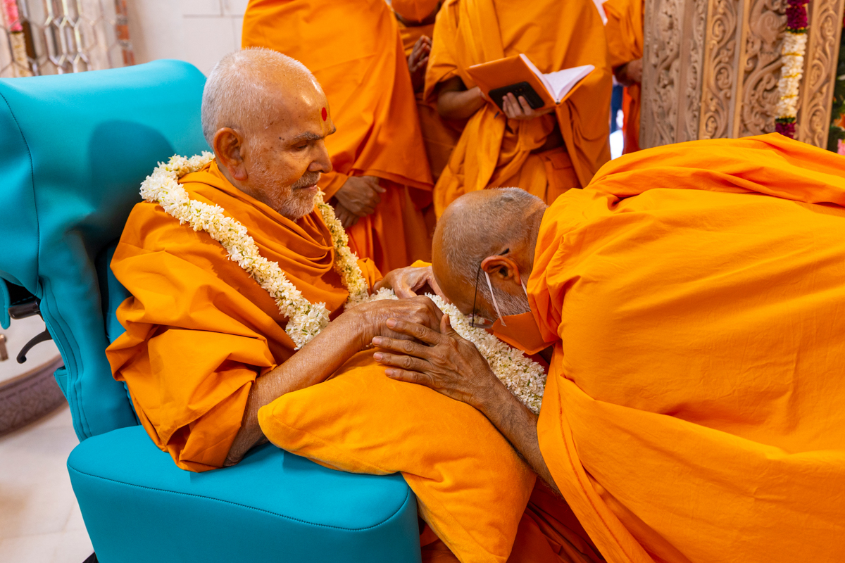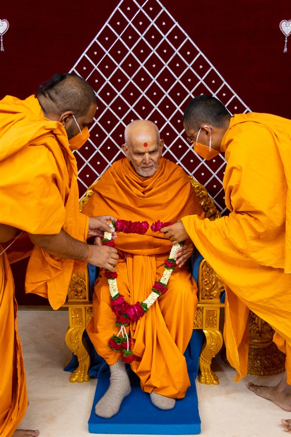 Swamis honor Swamishri with a garland