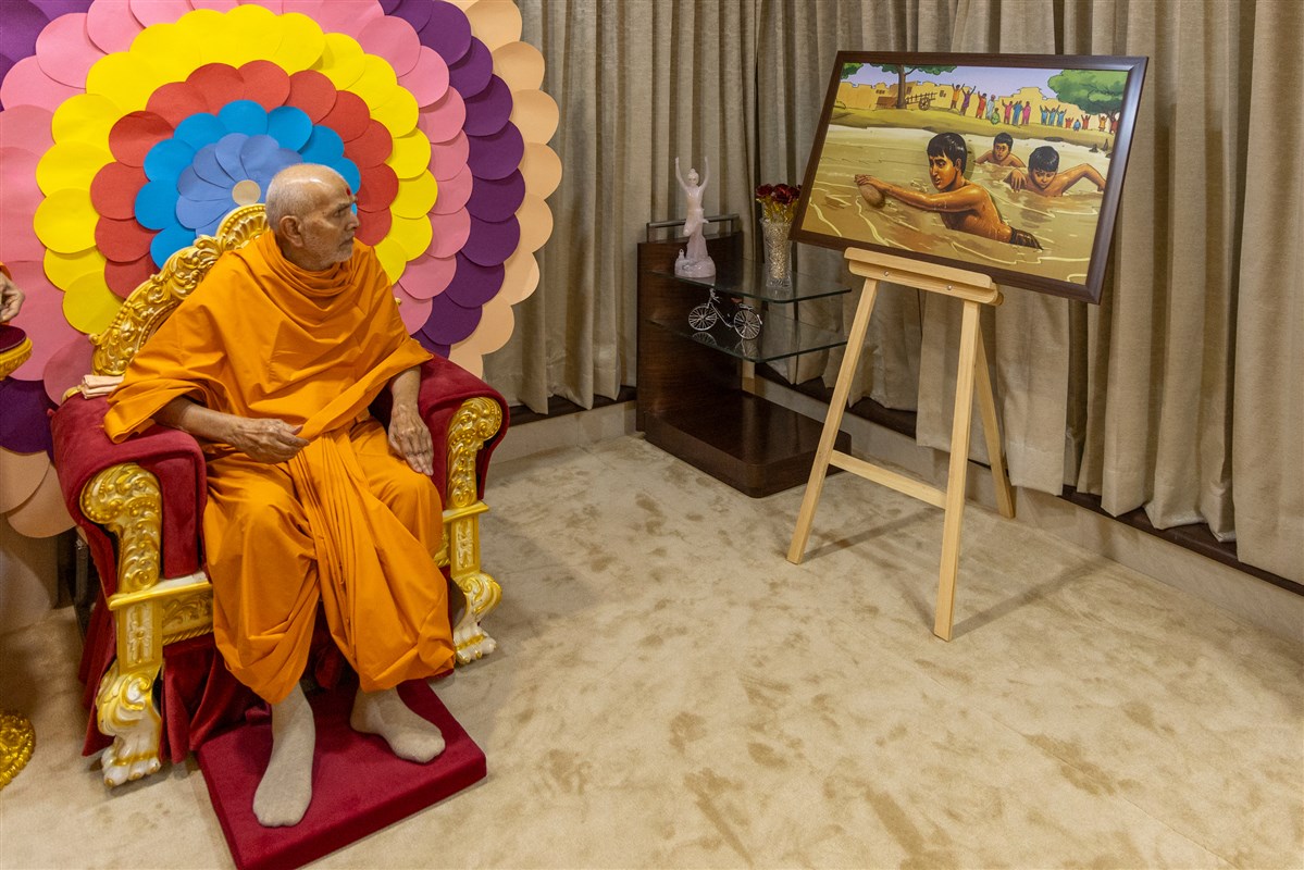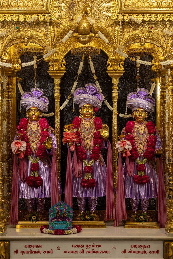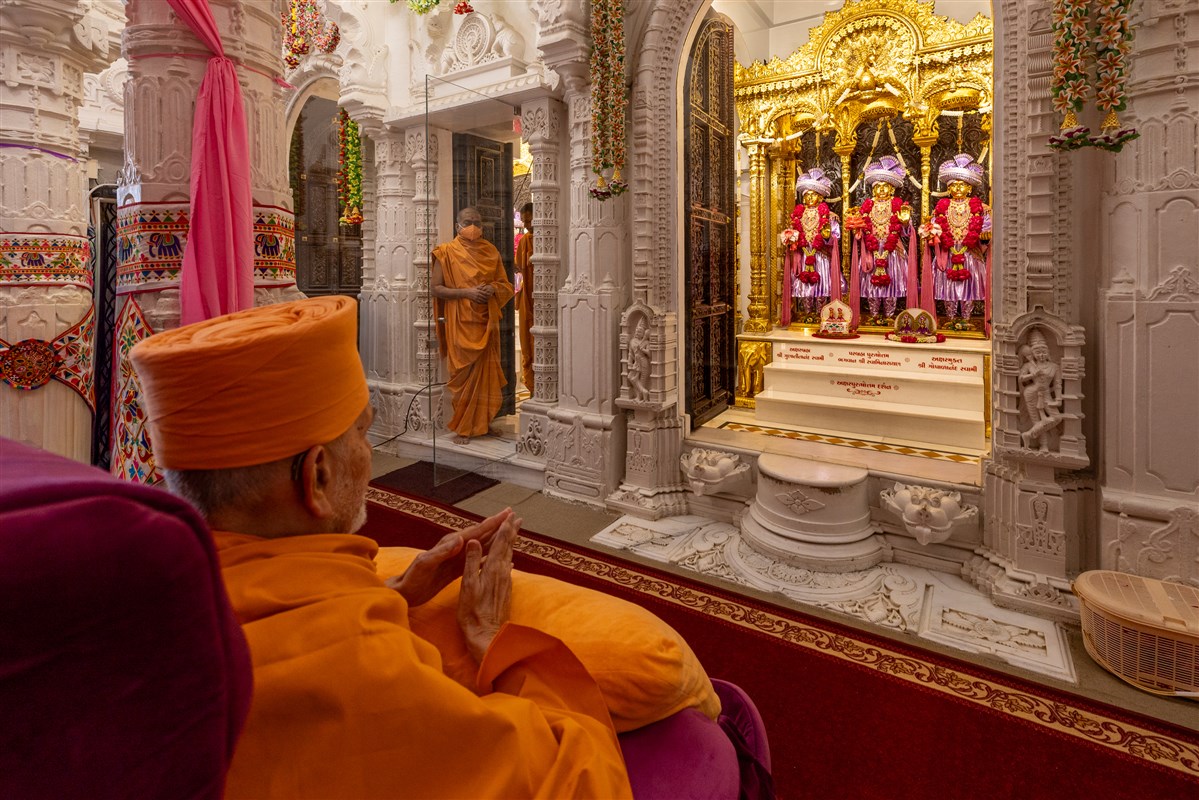 Swamishri engrossed in darshan of Bhagwan Swaminarayan, Aksharbrahma Gunatitanand Swami and Shri Gopalanand Swami