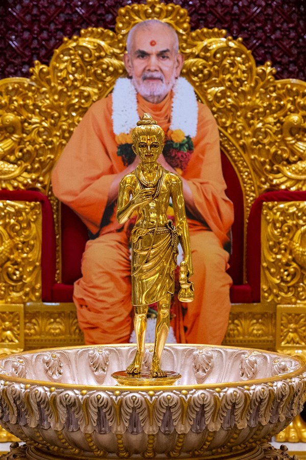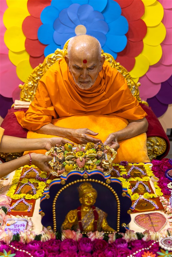 Swamishri offers thal to Shri Akshar-Purushottam Maharaj
