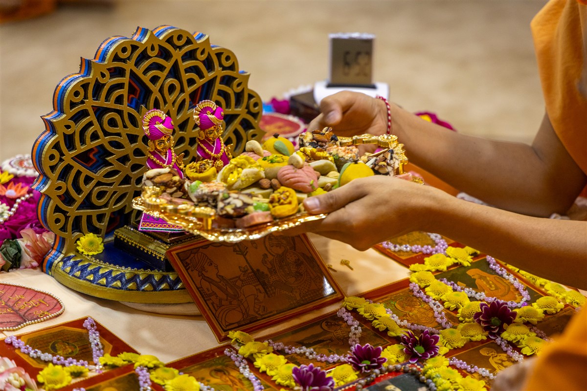 Swamishri offers thal to Shri Harikrishna Maharaj and Shri Gunatitanand Swami Maharaj