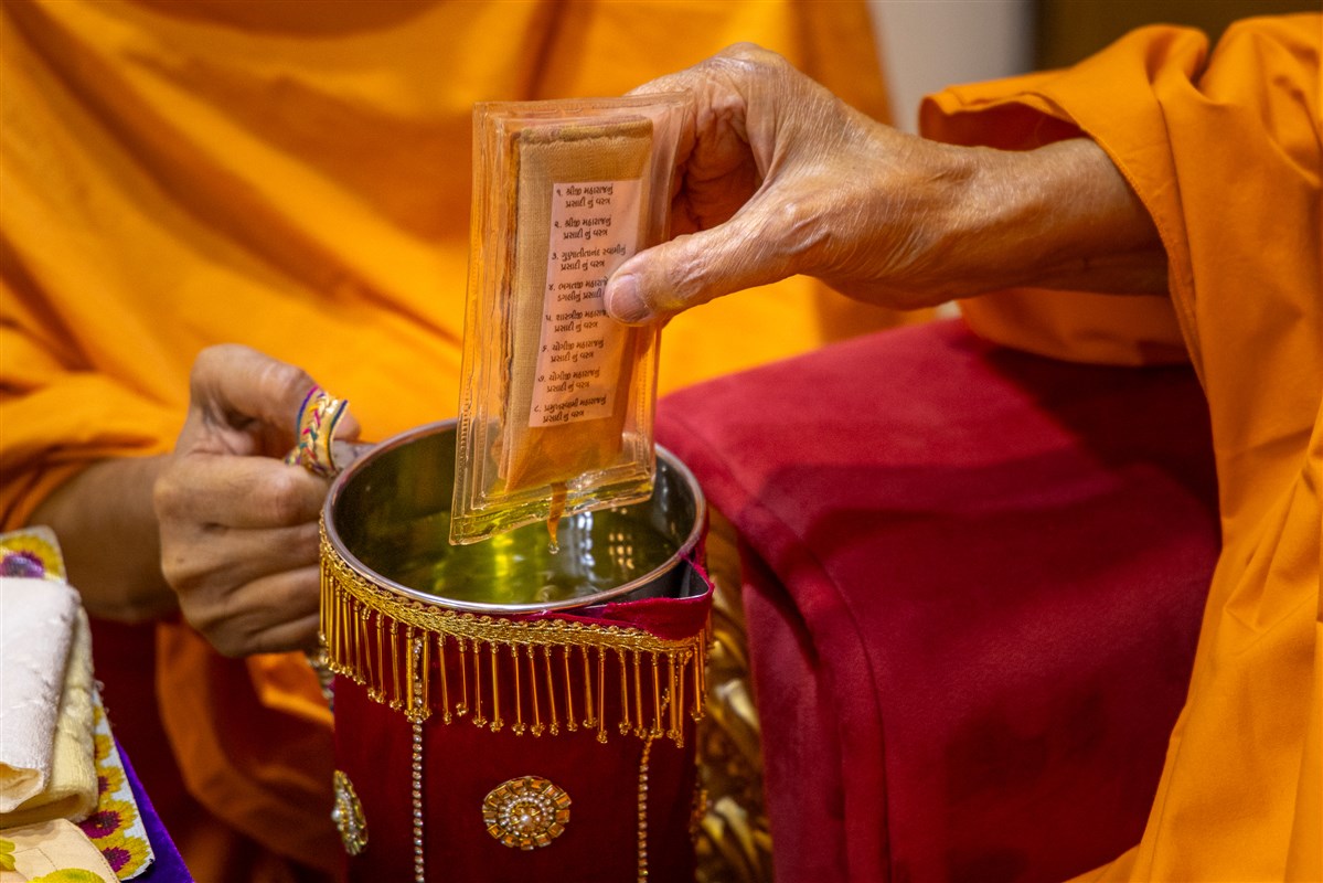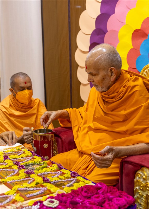 Swamishri sanctifies water with the holy relics of Bhagwan Swaminarayan and the Guru Parampara