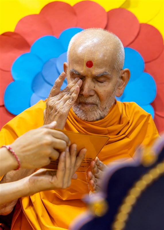 Swamishri touches his eyes after reverently touching the holy charanarvind of Shri Akshar-Purushottam Maharaj