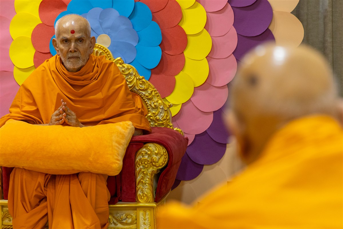 Swamishri greets Pujya Tyagvallabh Swami with folded hands
