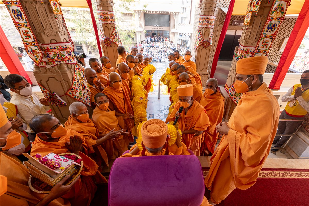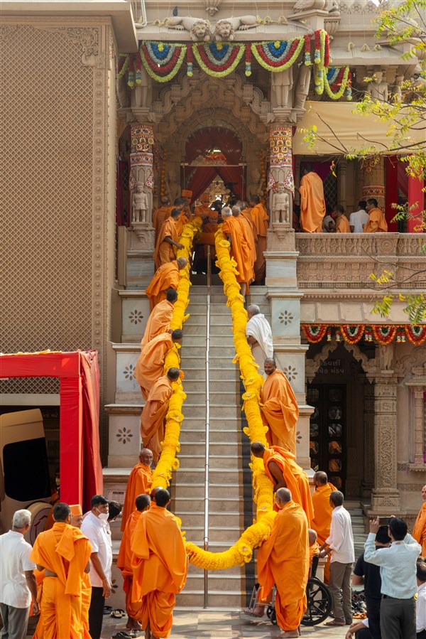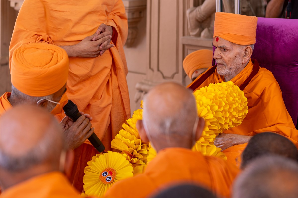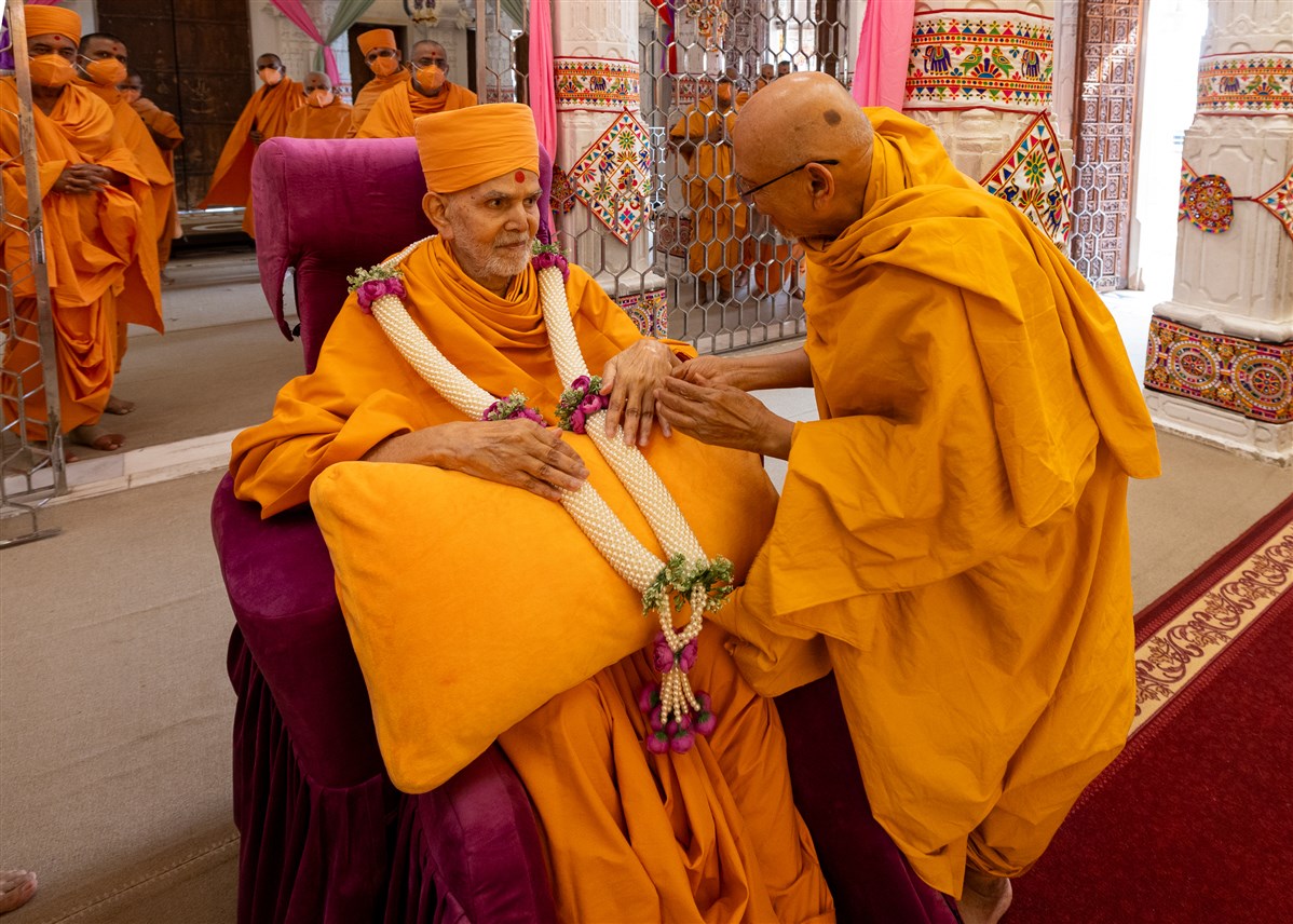 Pujya Tyagvallabh Swami honor Swamishri with a garland
