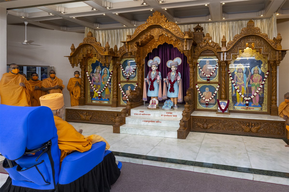 Swamishri engrossed in darshan of Shri Akshar-Purushottam Maharaj
