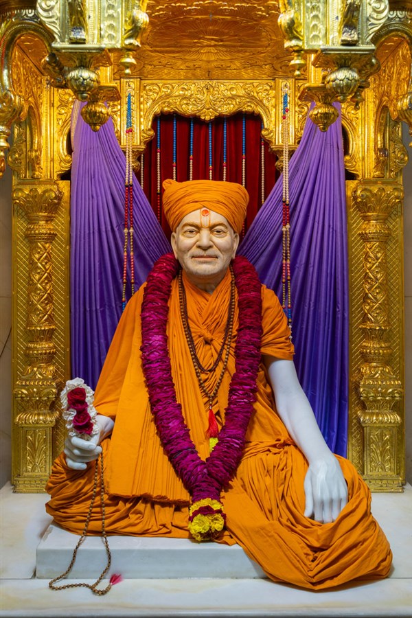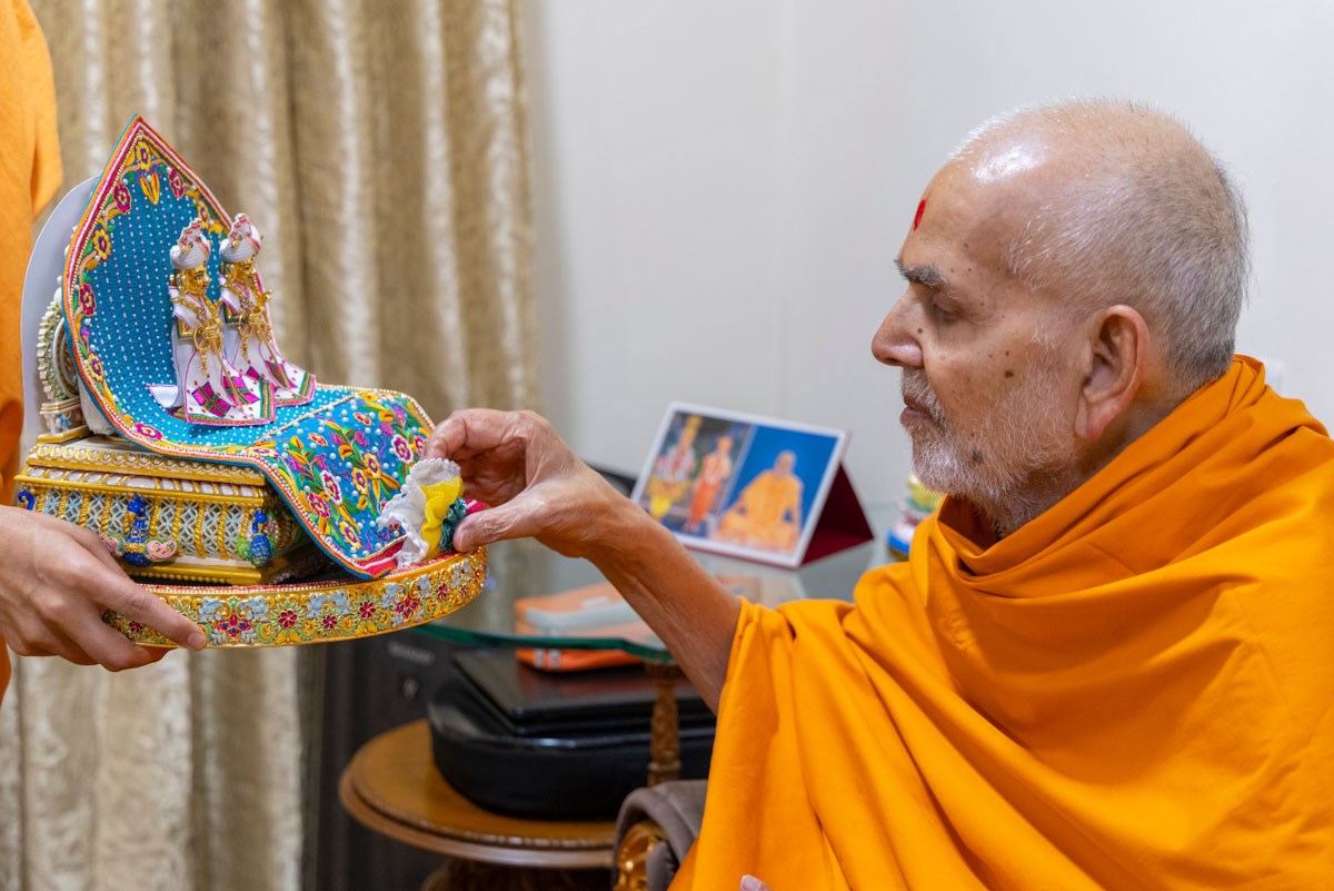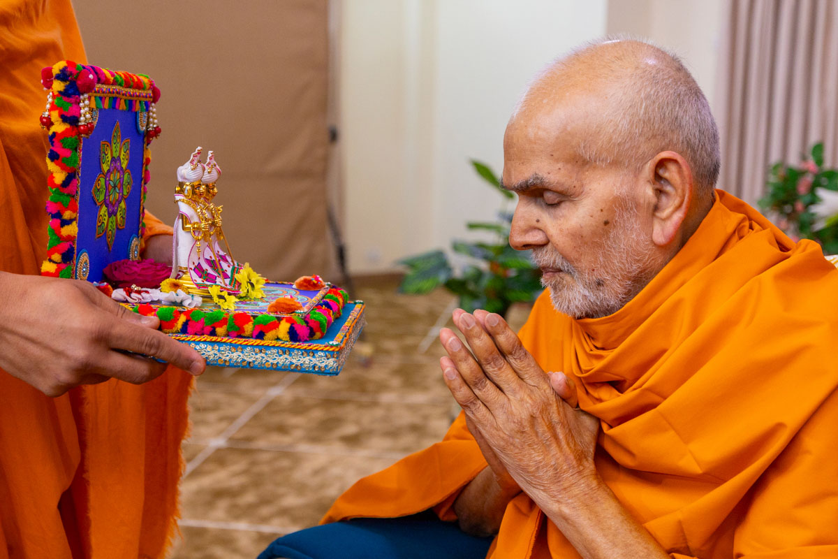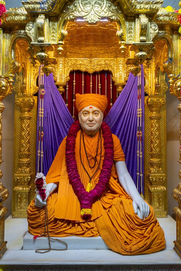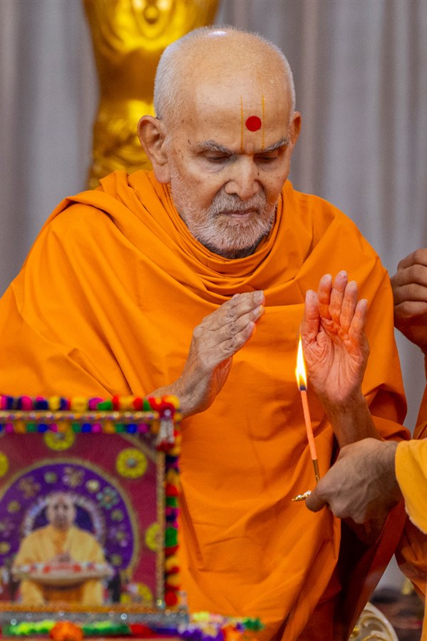 Param Pujya Mahant Swami Maharaj engrossed in darshan of Shri Harikrishna Maharaj and Shri Gunatitanand Swami Maharaj