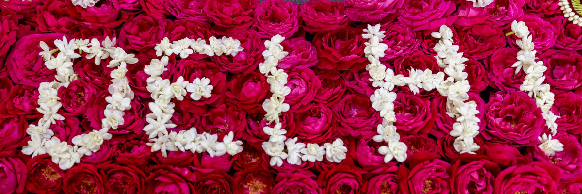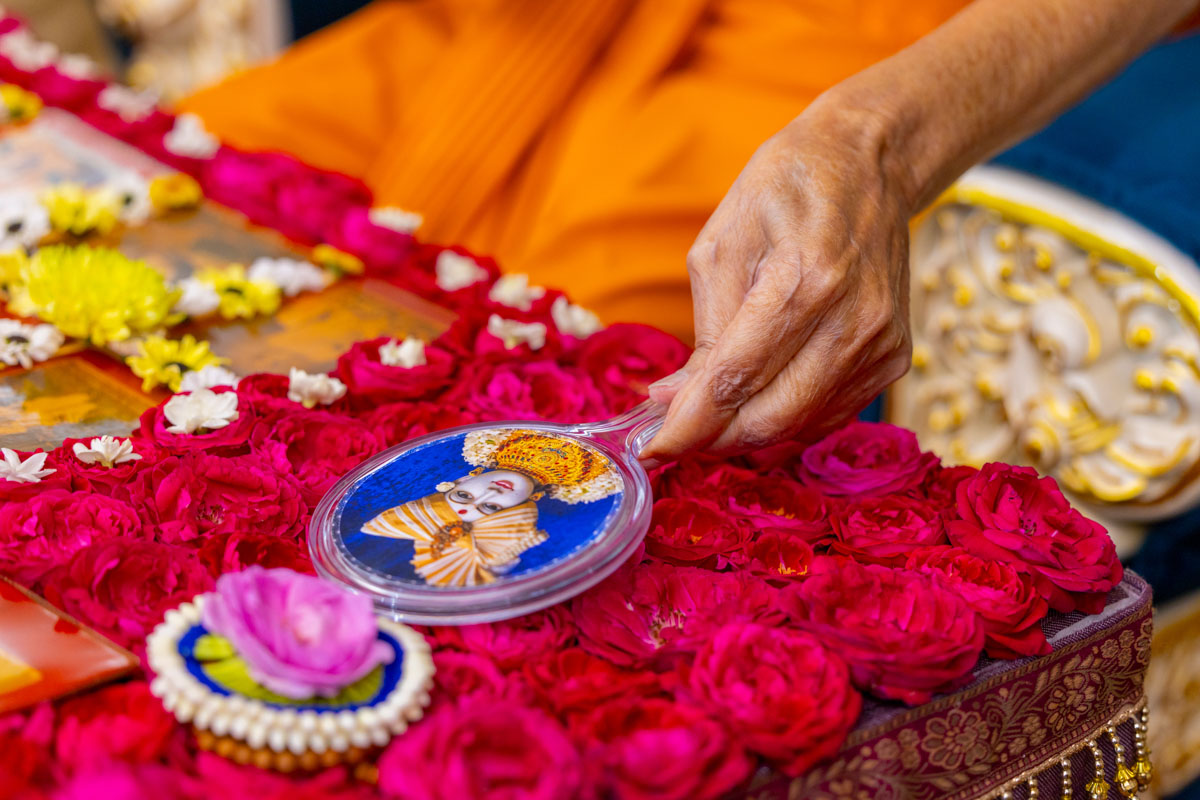 Swamishri offers a flower to Shri Harikrishna Maharaj and Shri Gunatitanand Swami Maharaj