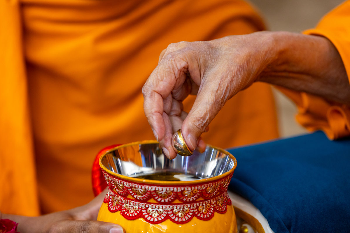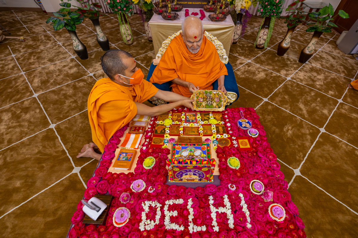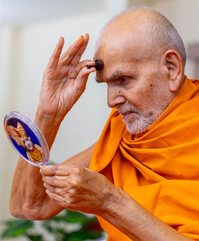 Swamishri sanctifies water with the holy relics of Bhagwan Swaminarayan and the Guru Parampara
