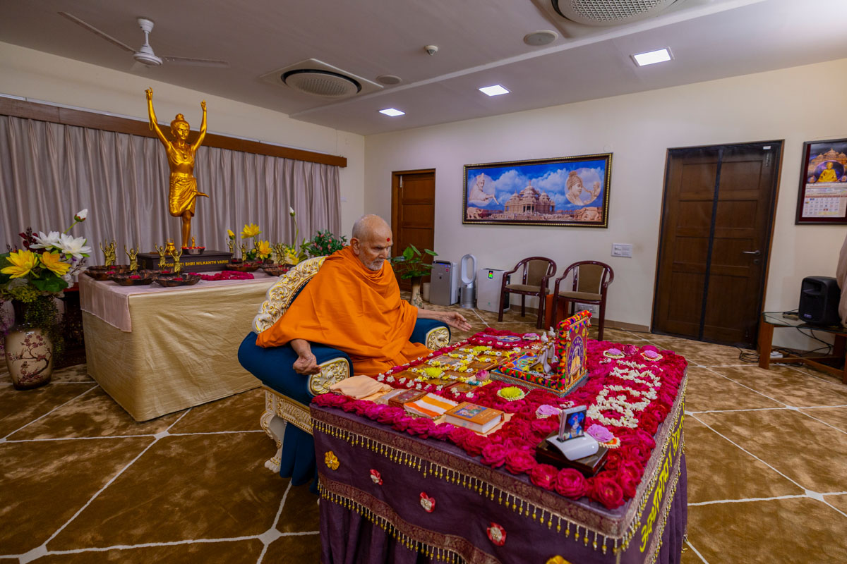 Pujya Ishwarcharan Swami and swamis doing darshan of Swamishri
