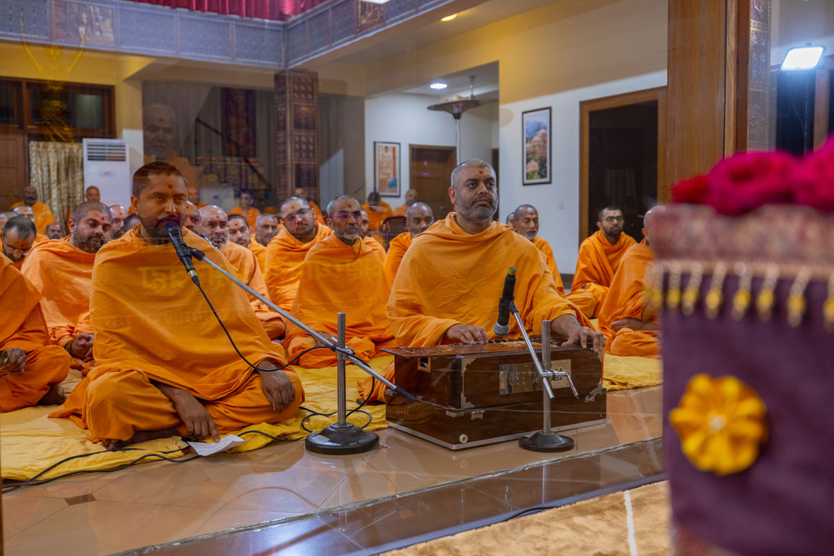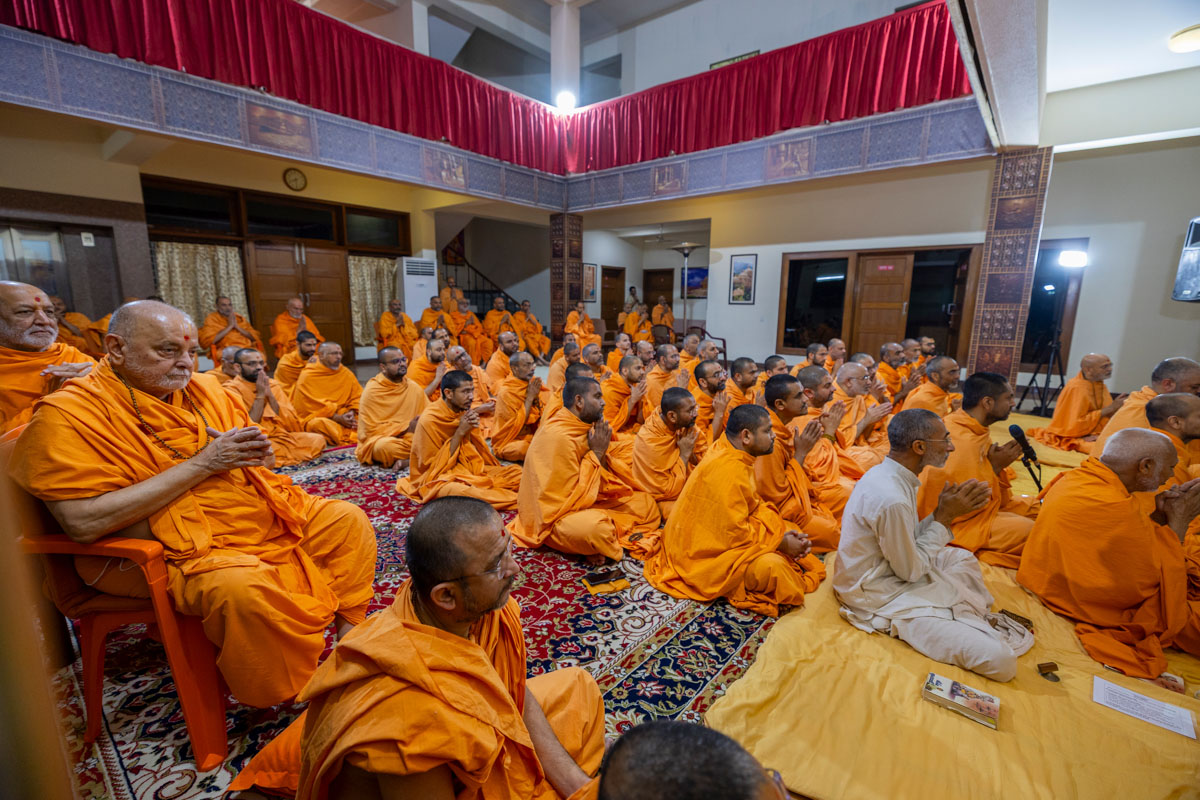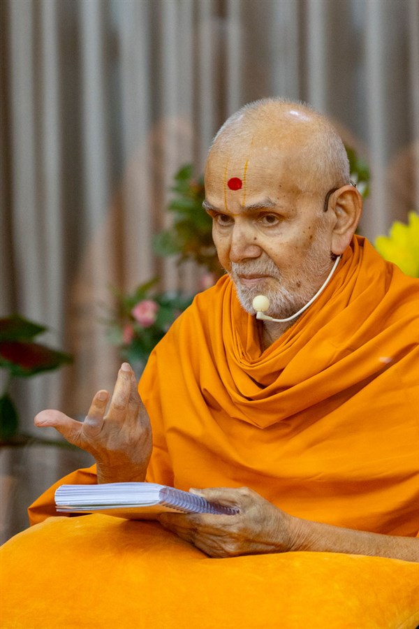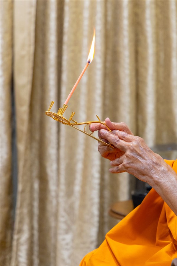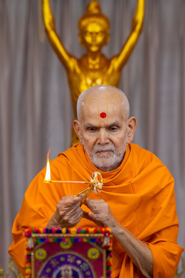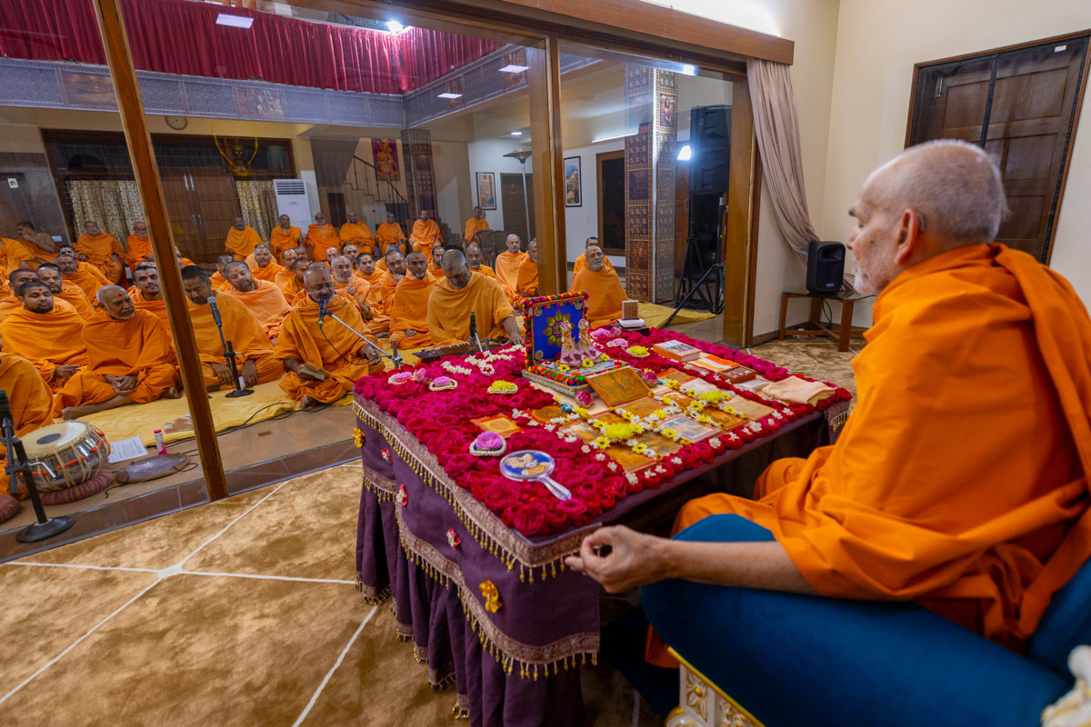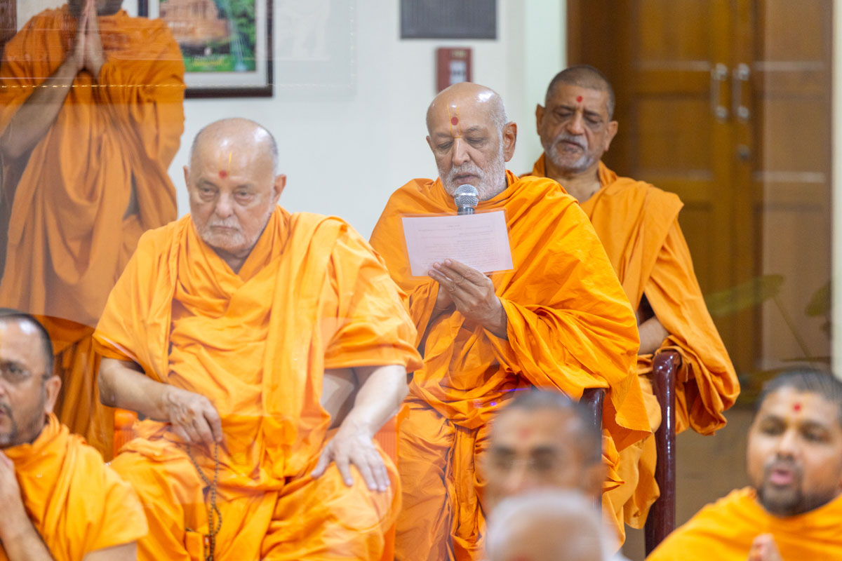 Dharmavatsal Swami leads everyone in reciting the sadhana mantra and daily prayer in Swamishri's puja