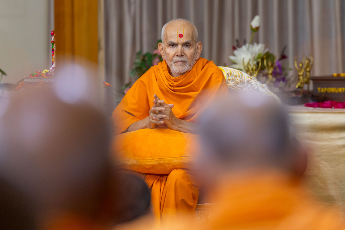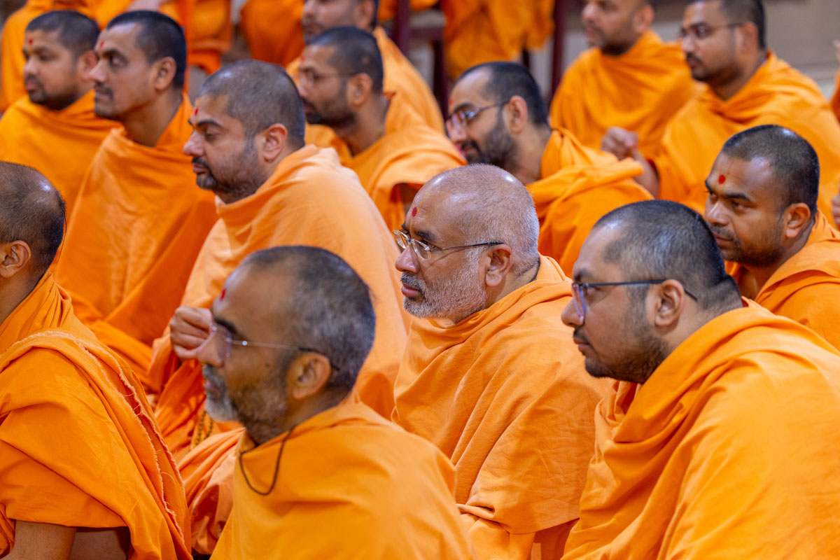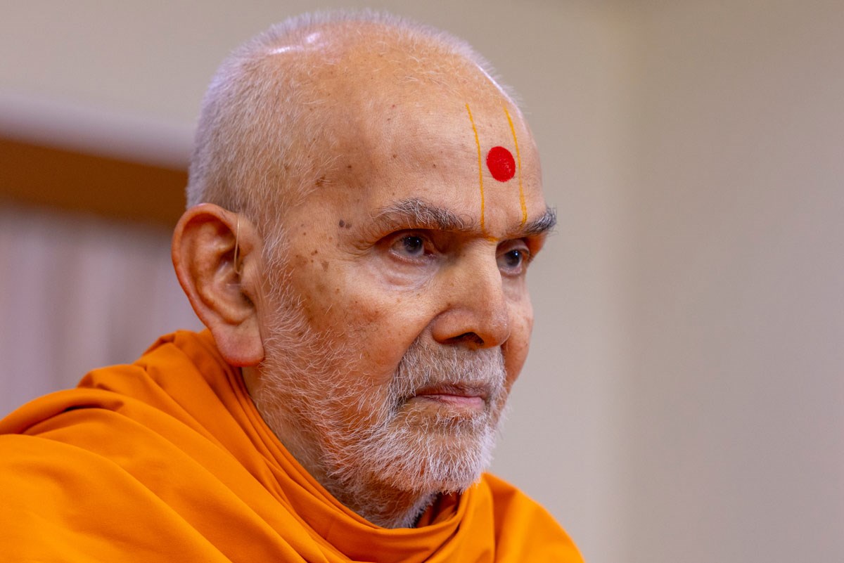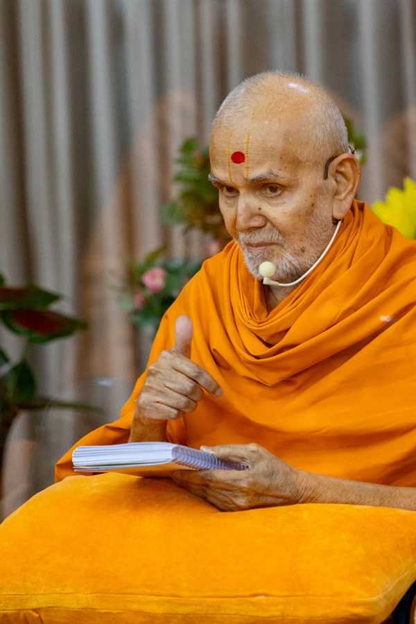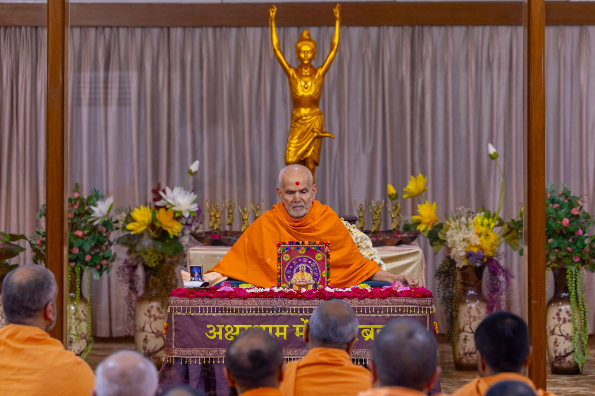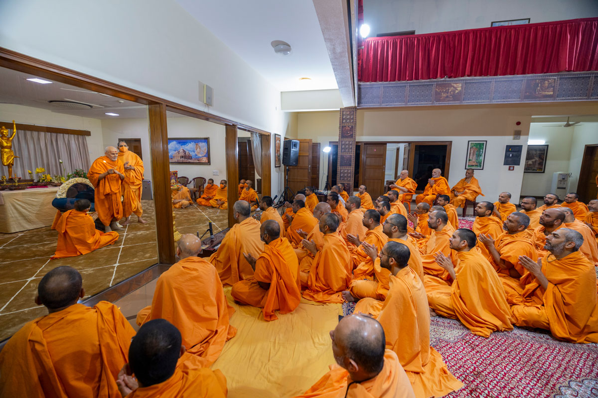Dharmavatsal Swami leads everyone in reciting the sadhana mantra and daily prayer in Swamishri's puja