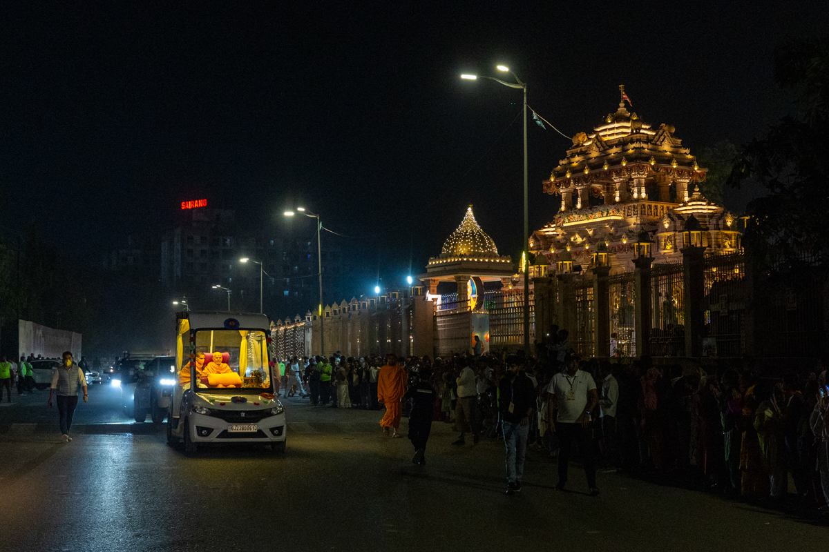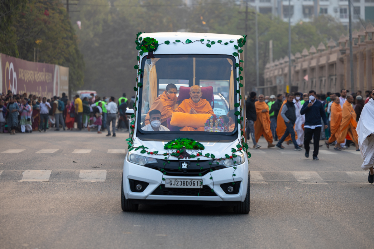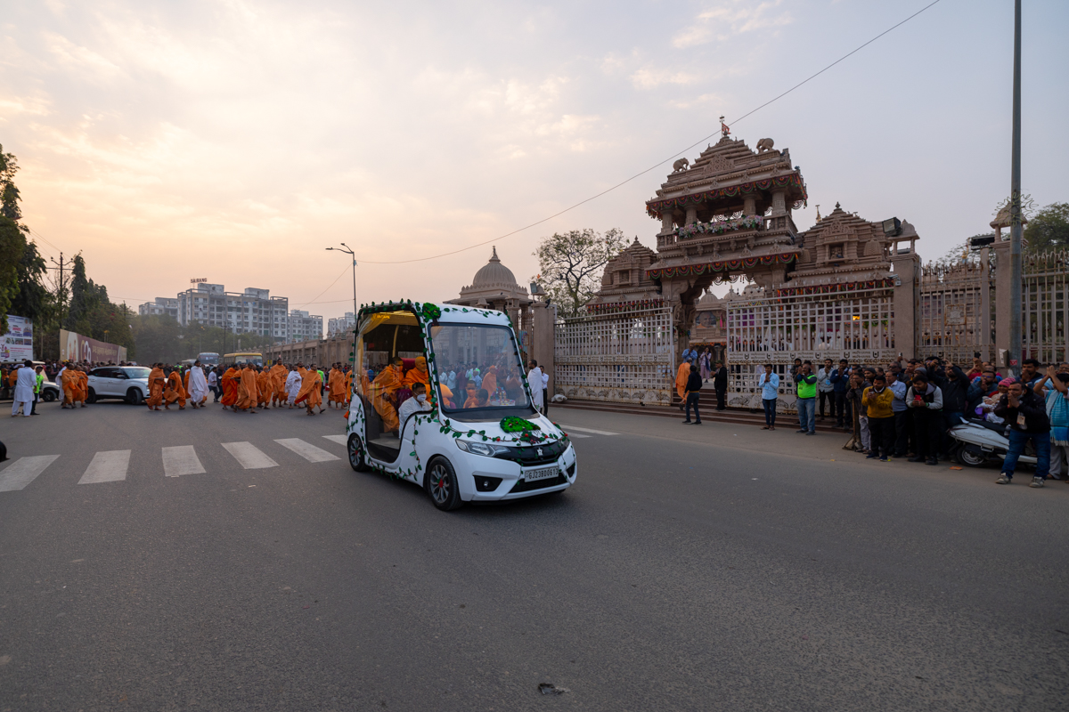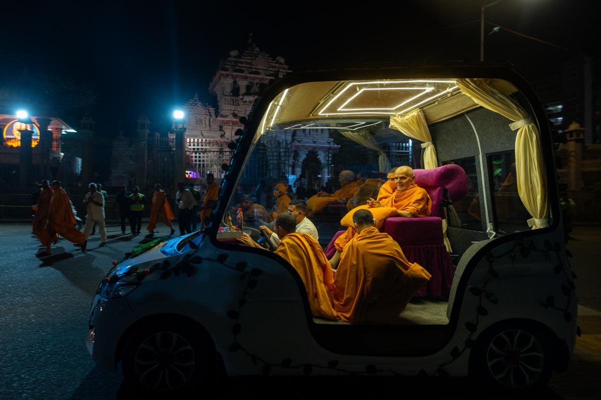 Swamishri returns to BAPS Shri Swaminarayan Mandir, Atladara (Vadodara), after the assembly