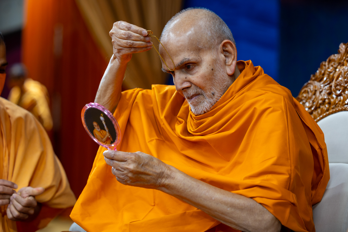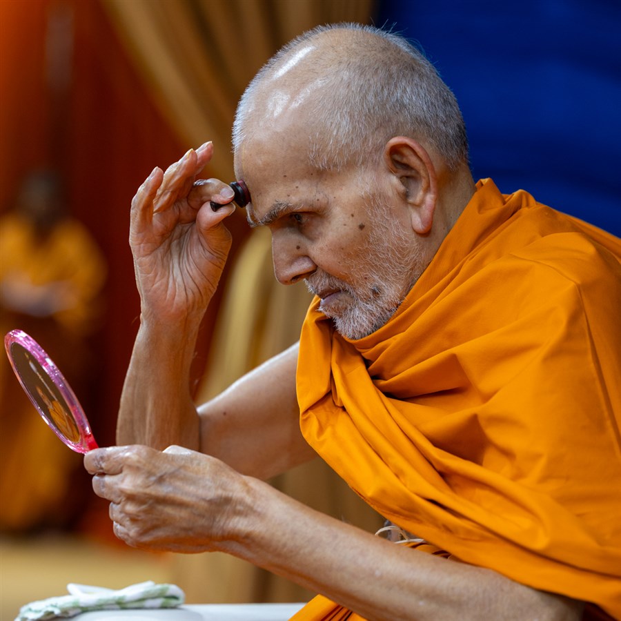 Swamishri applies a tilak on his forehead