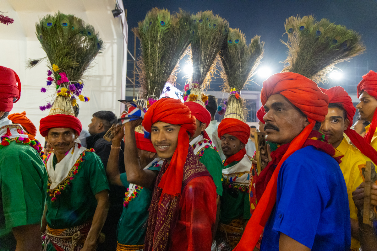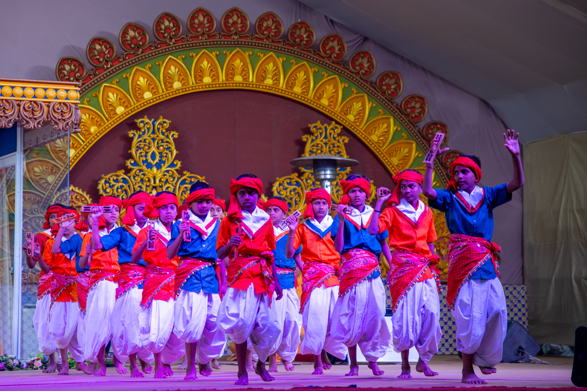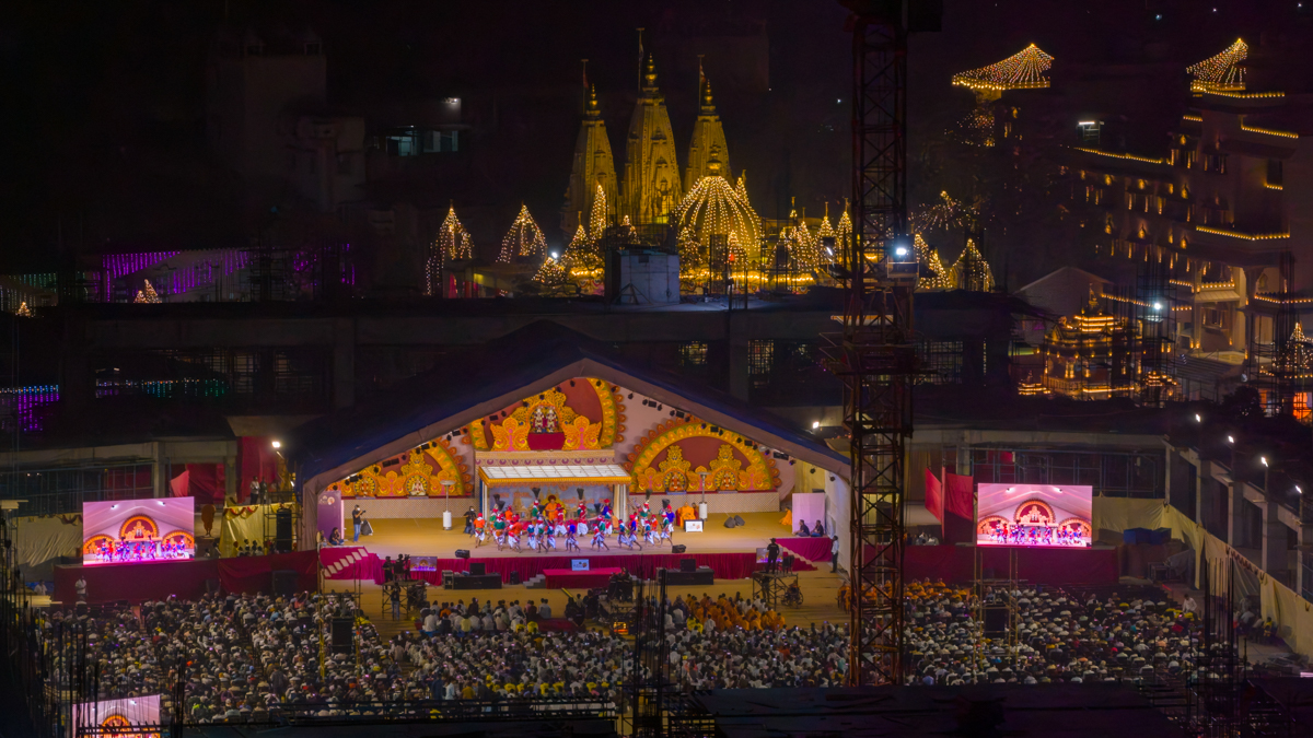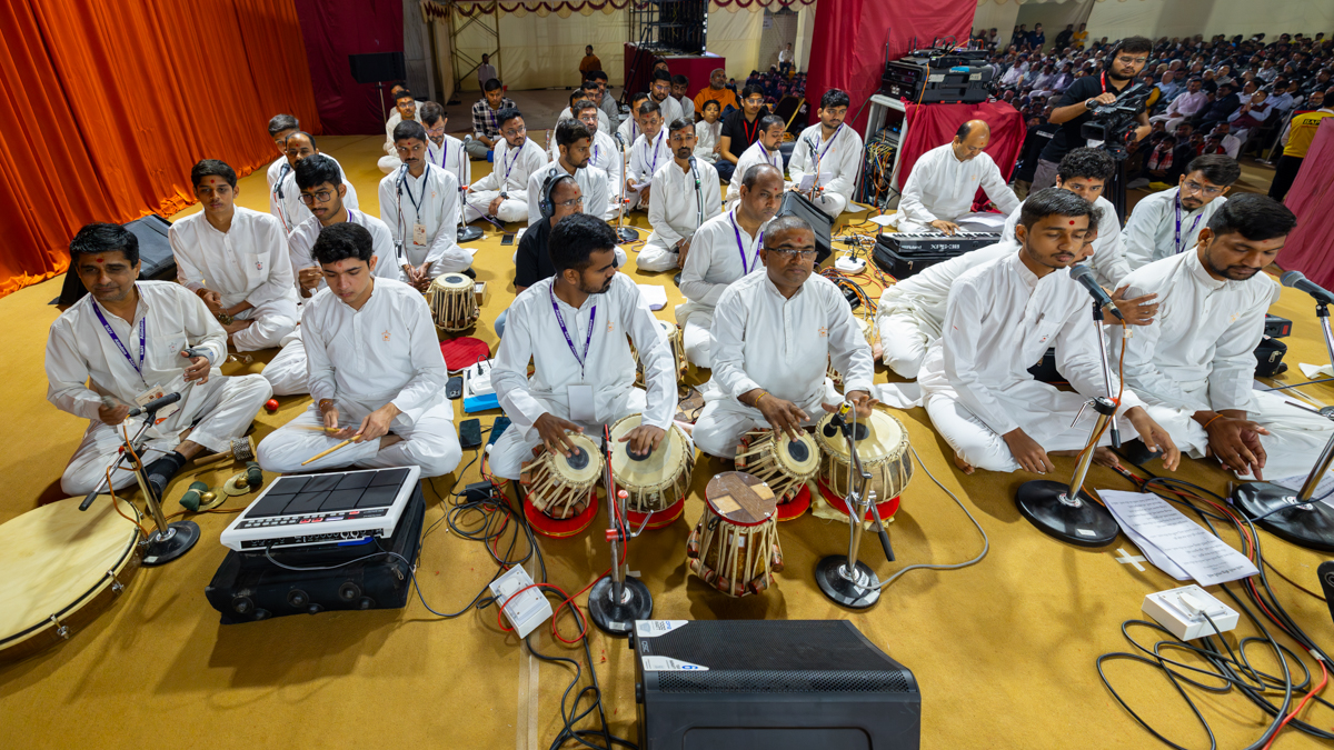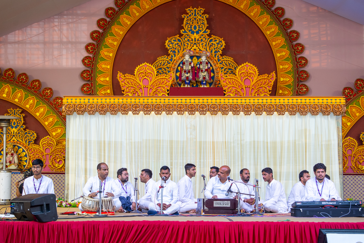 Yuvaks and devotees sing kirtans at the beginning of the assembly