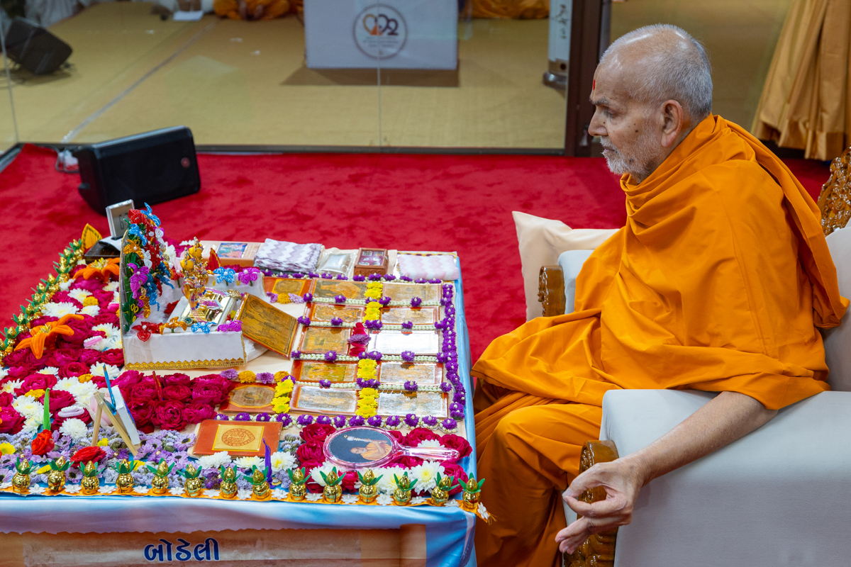 Swamishri engrossed in darshan of Shri Harikrishna Maharaj and Shri Gunatitanand Swami Maharaj
