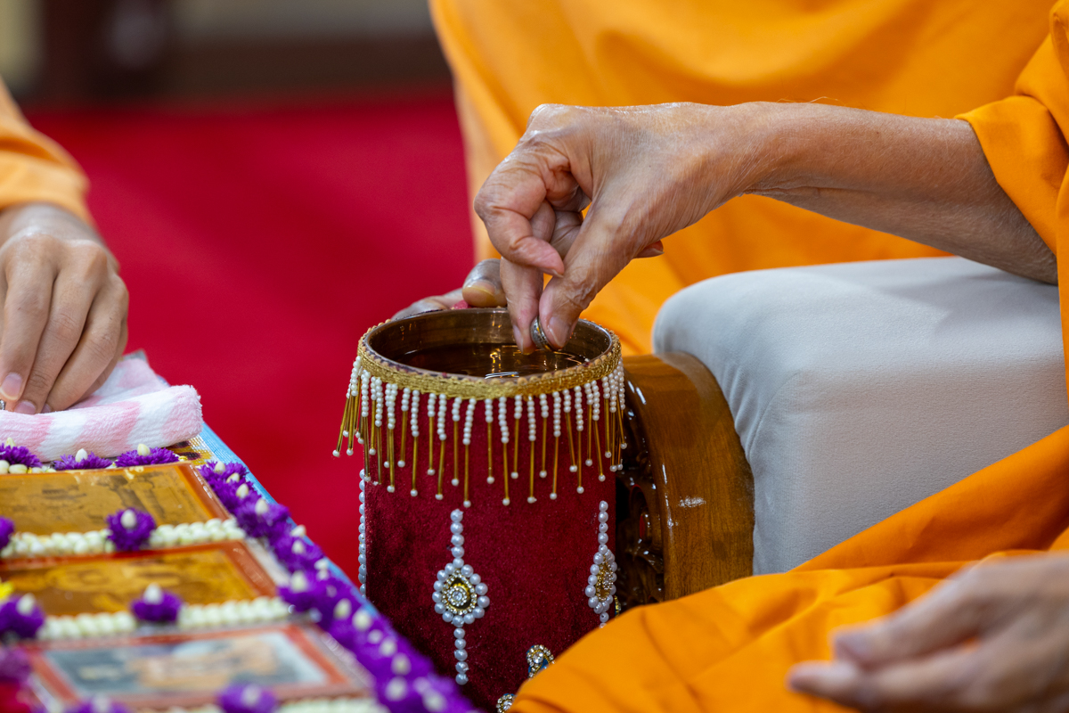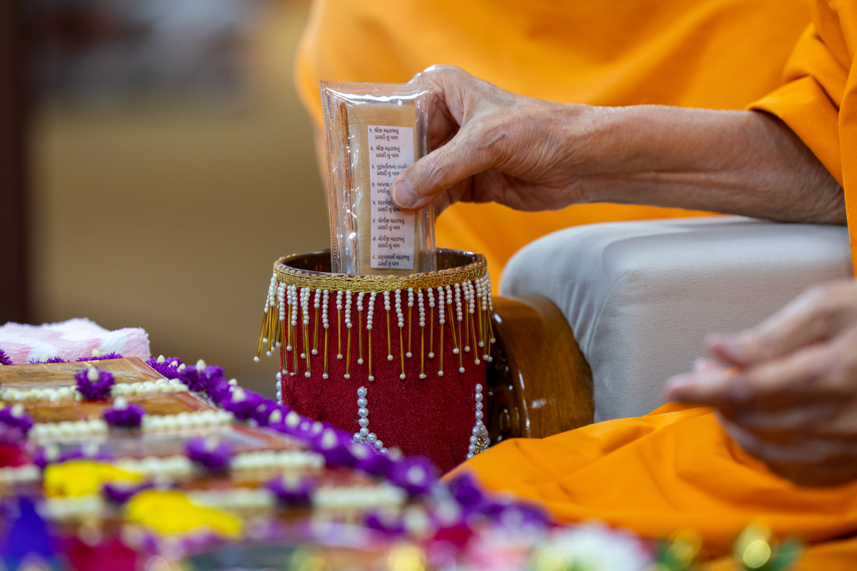 Swamishri sanctifies water with the holy relics of Bhagwan Swaminarayan and the Guru Parampara