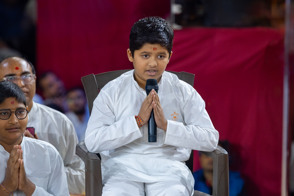 A balak leads everyone in reciting the sadhana mantra and daily prayer in Swamishri's puja