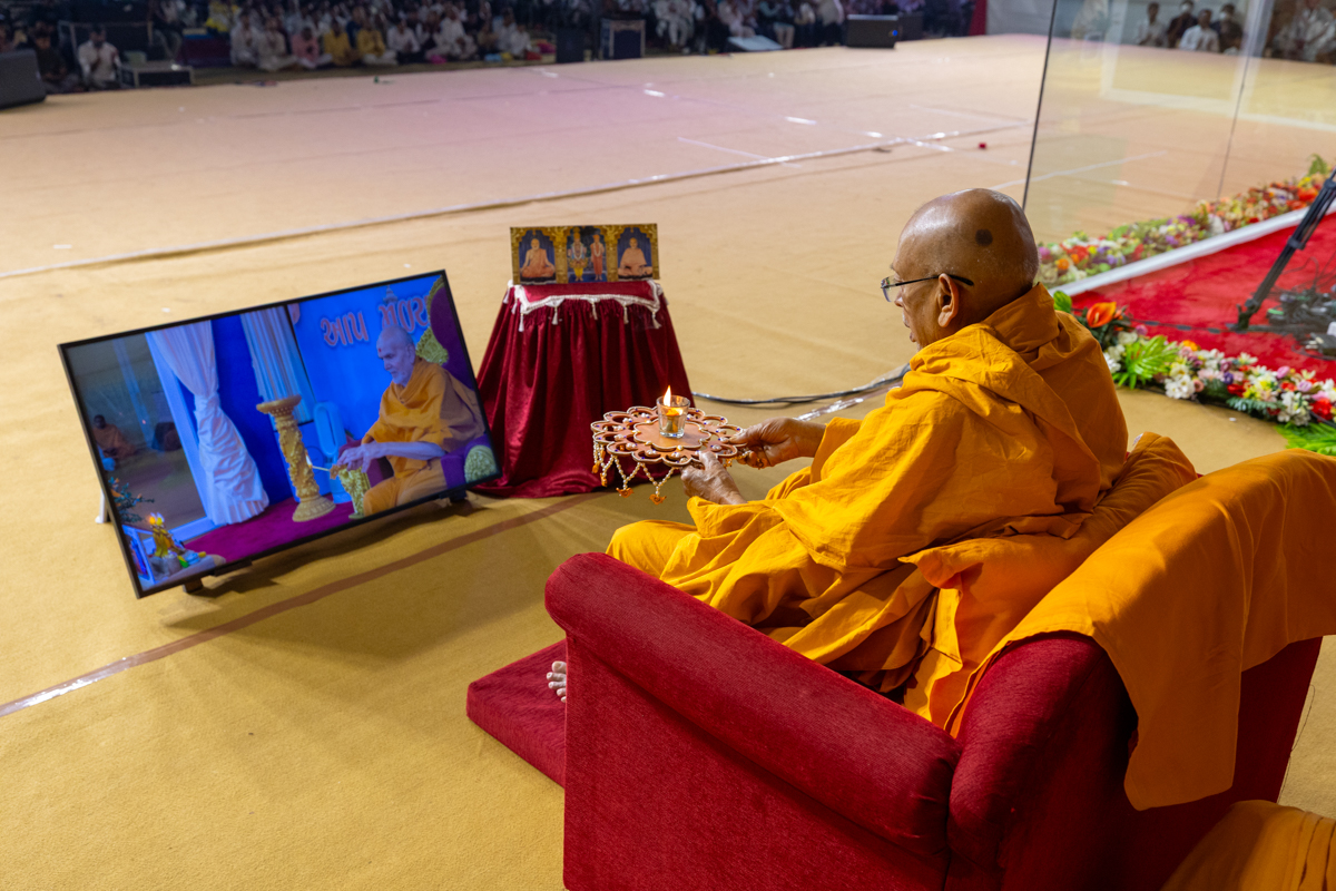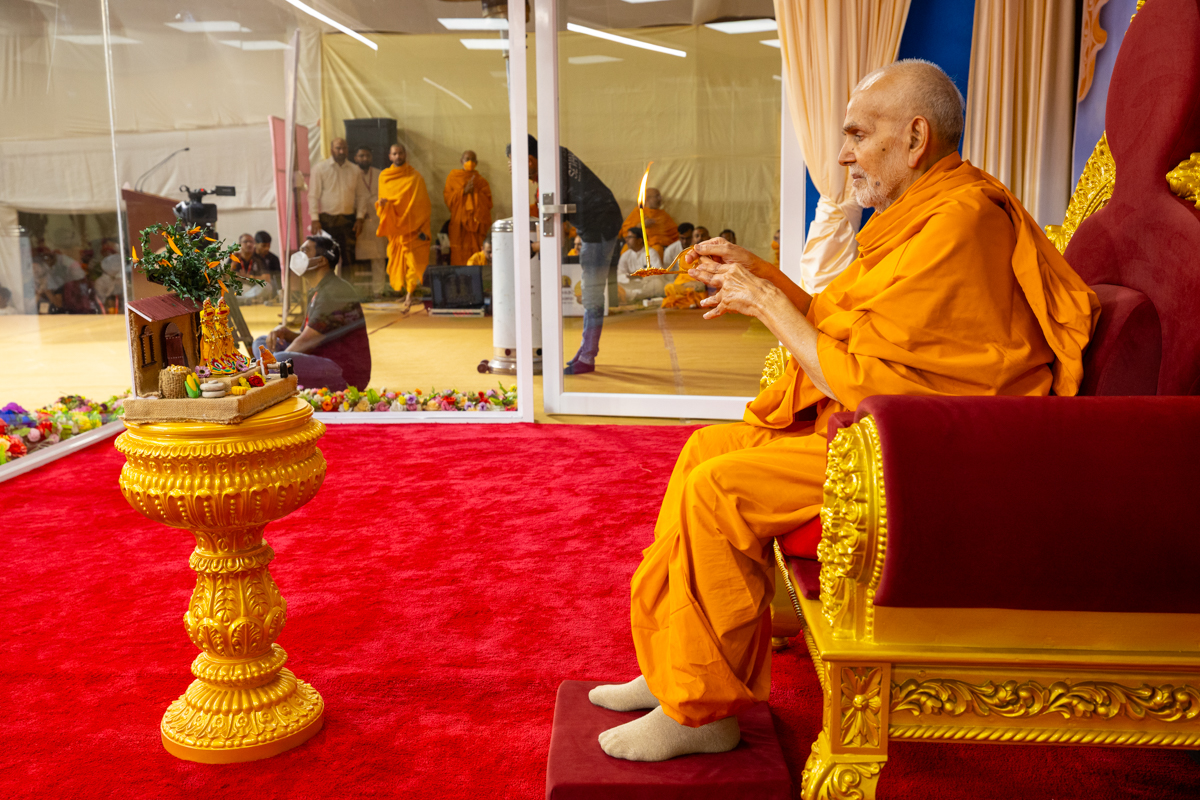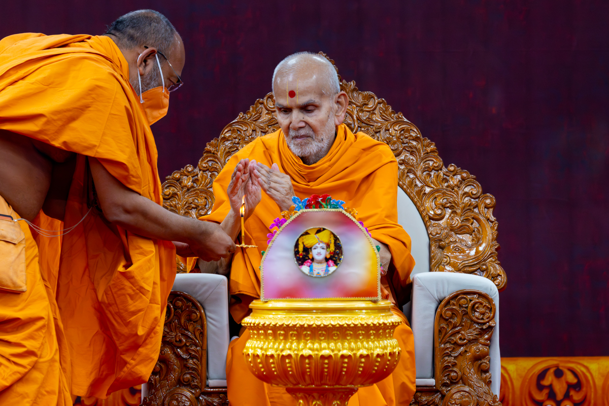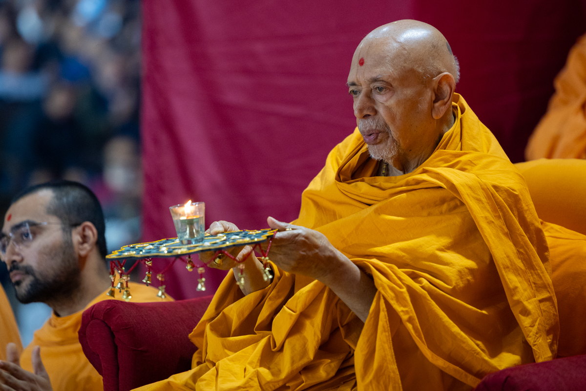 Swamishri performs the morning arti