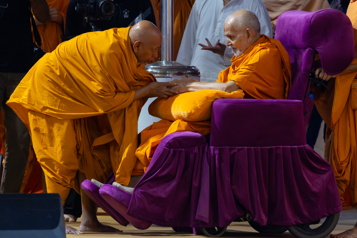 Pujya Tyagvallabh Swami greets Swamishri