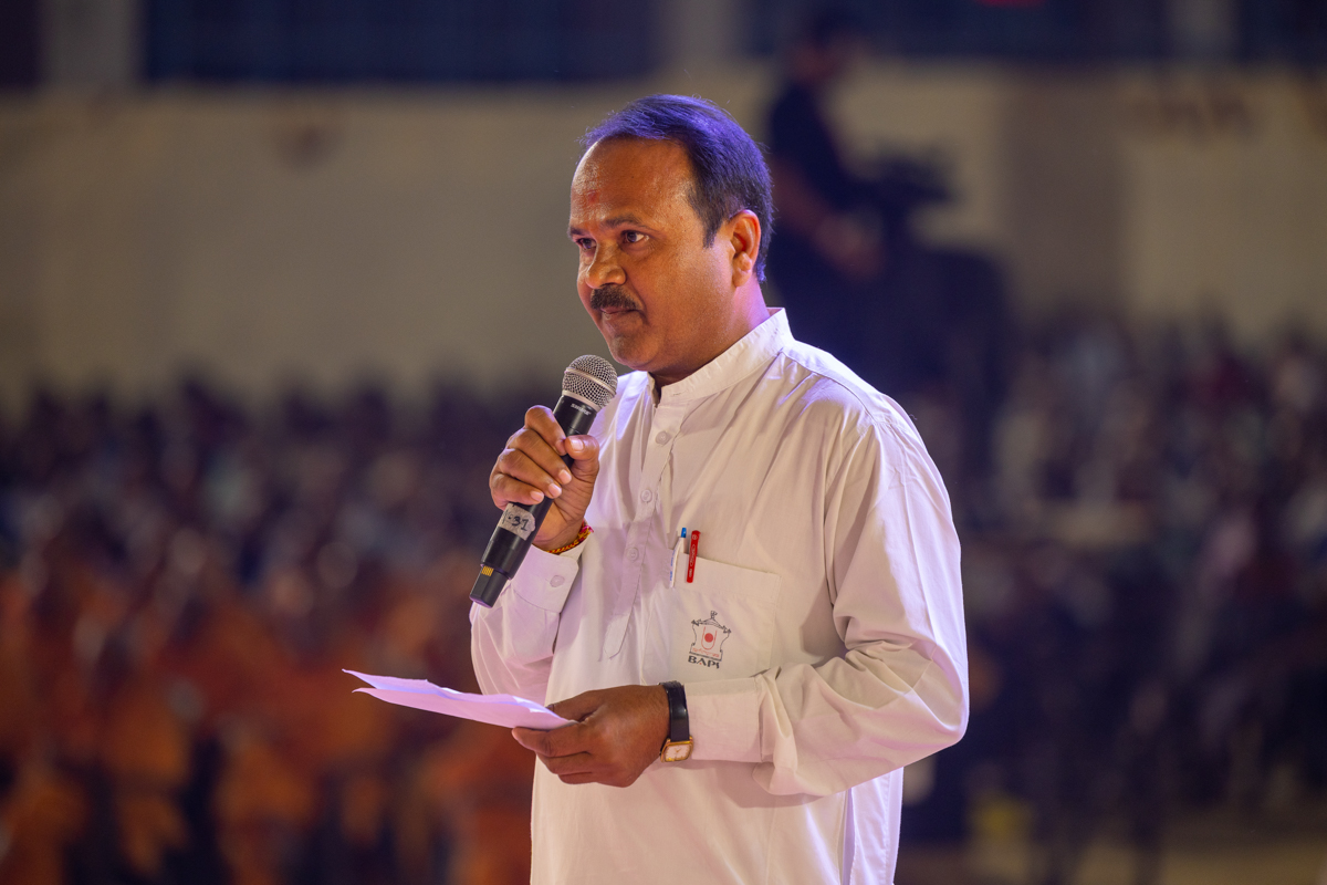 A devotee poses questions to a swami during an interactive session