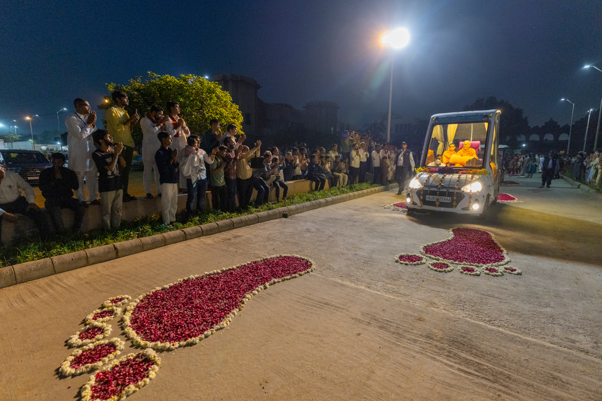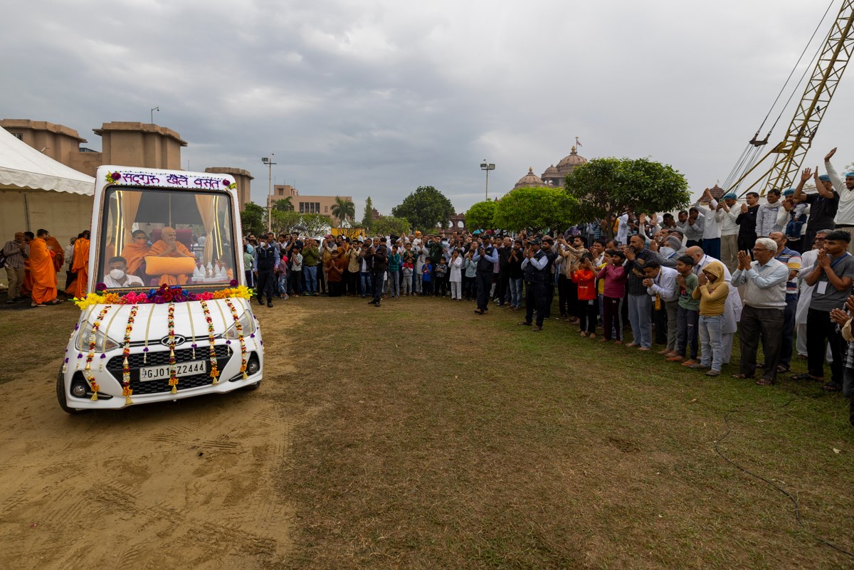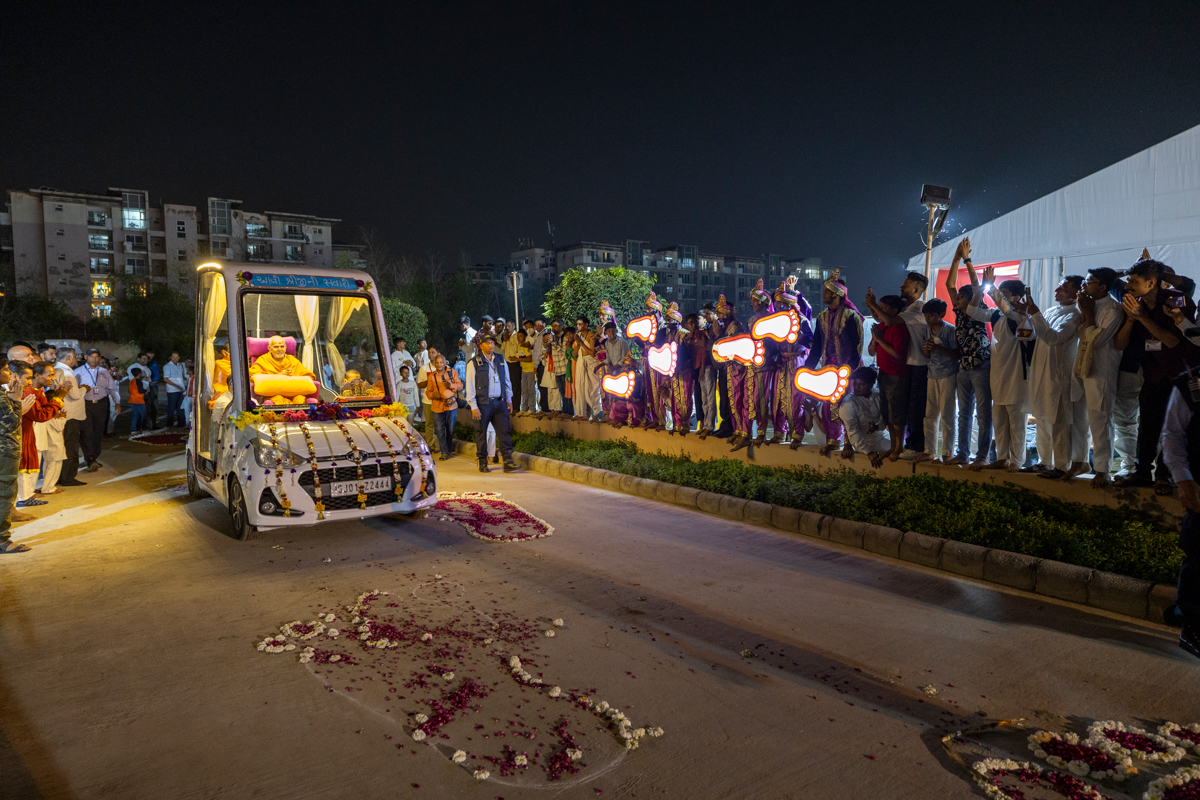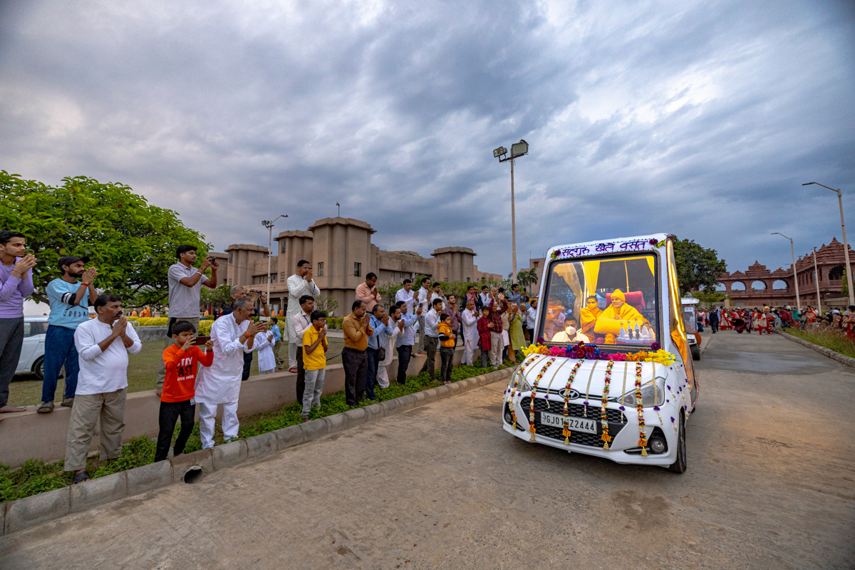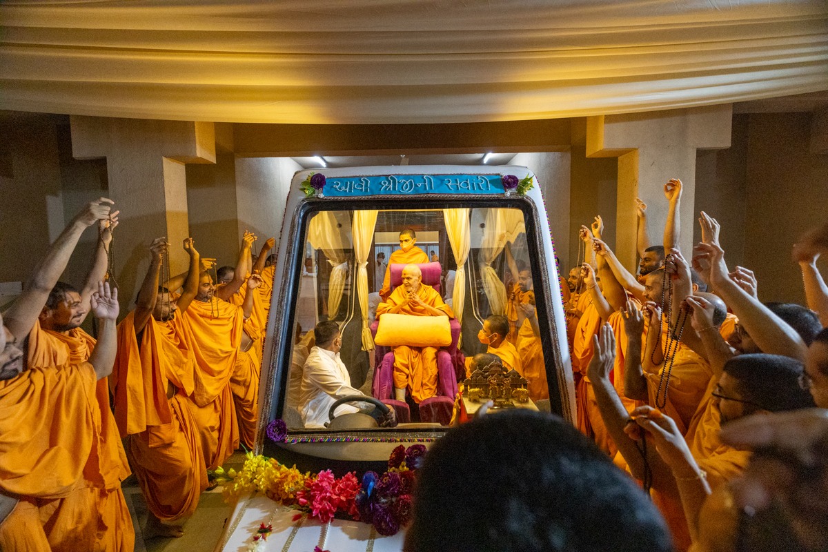 Param Pujya Mahant Swami Maharaj on his way to the assembly hall