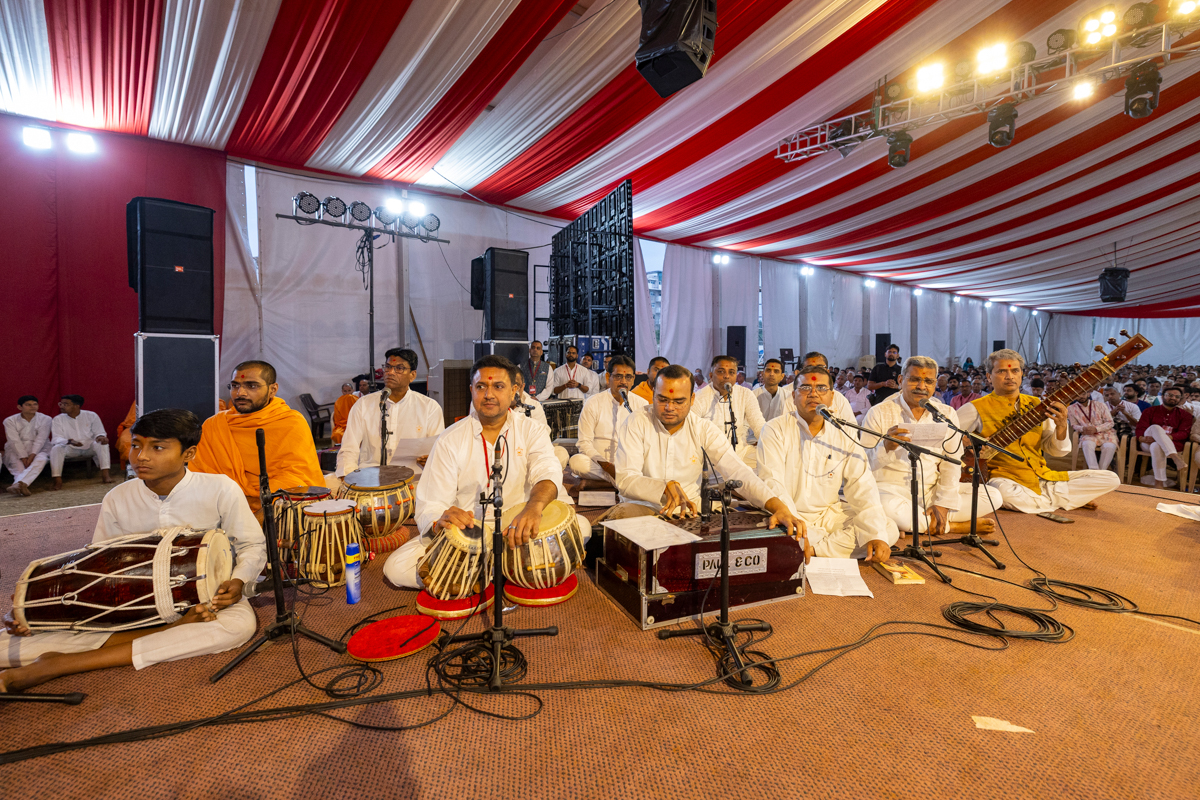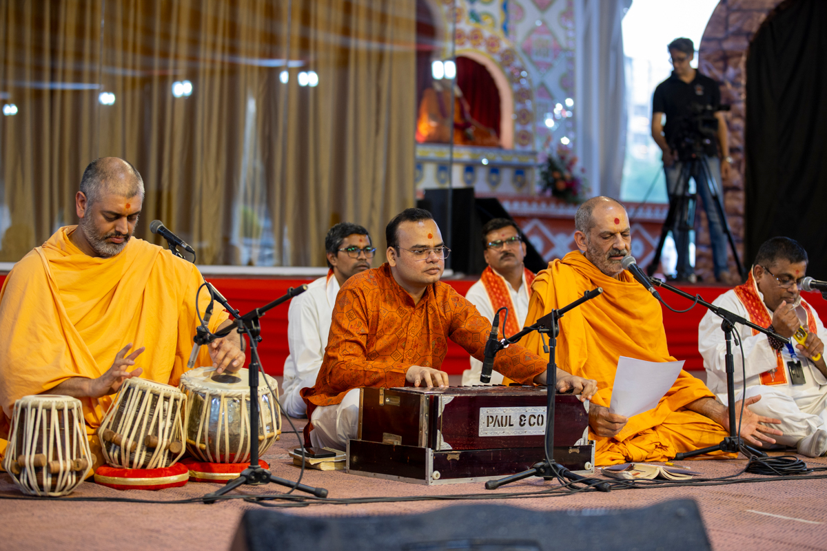 A swami and devotees sing kirtans at the beginning of the evening 'Akshardham Sevak Din' assembly