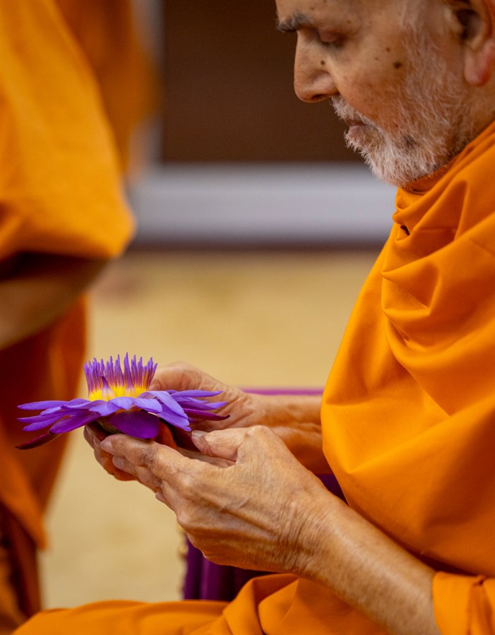 Swamishri observes a flower