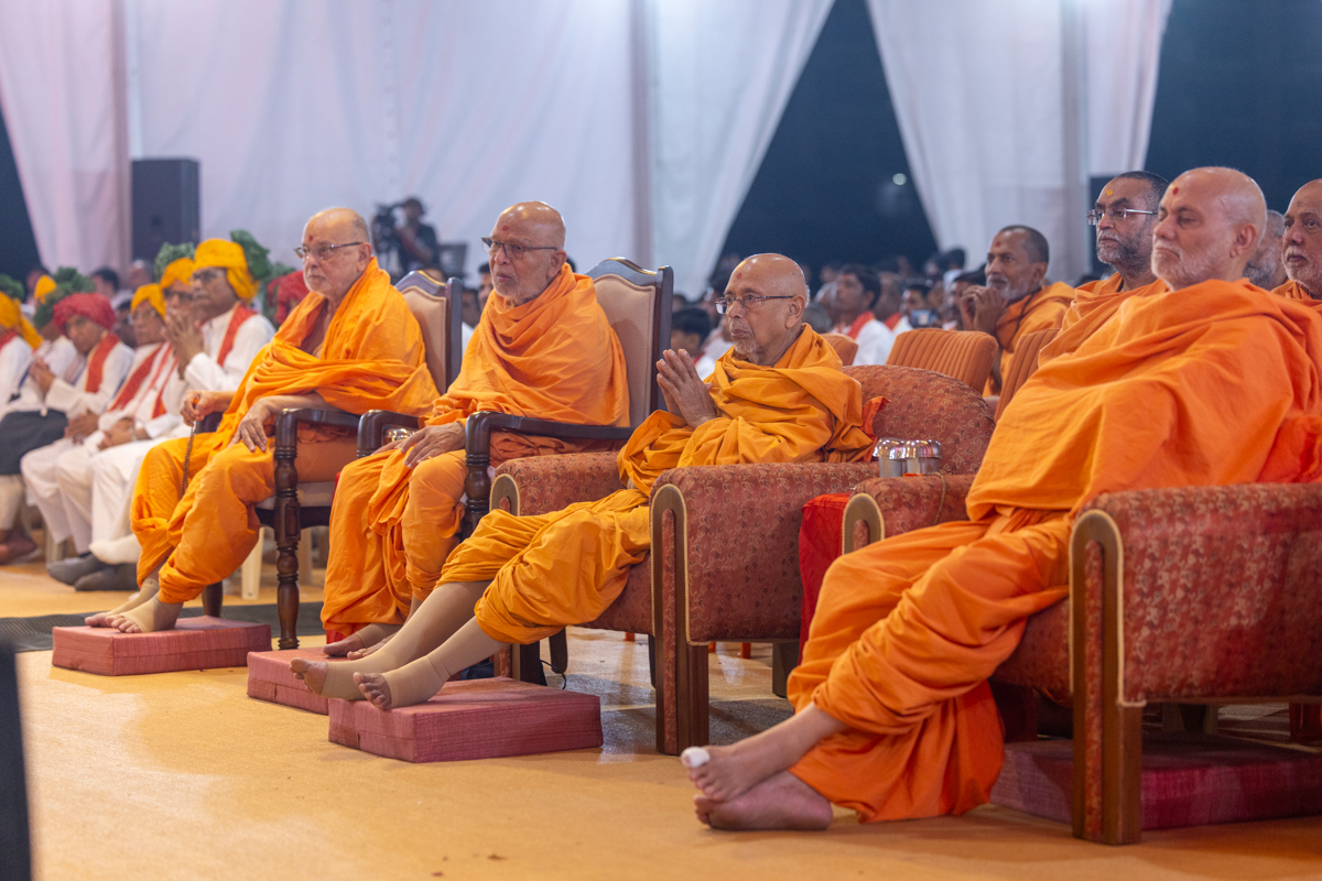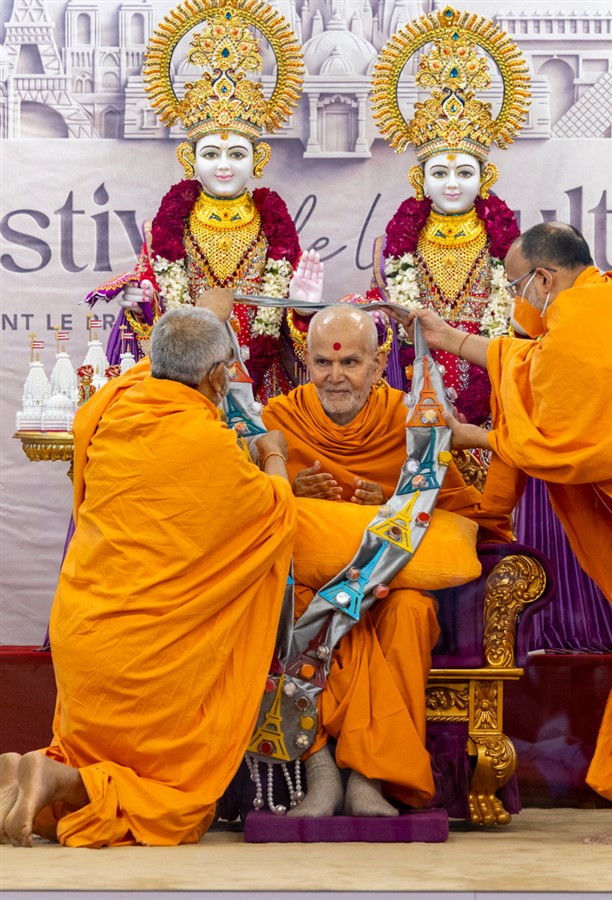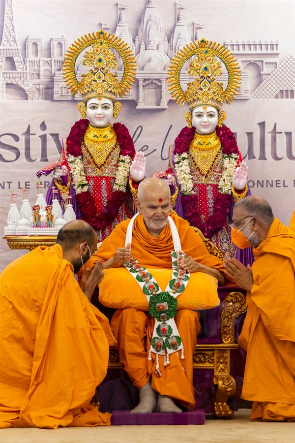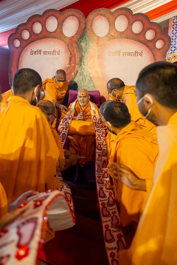Swamis honor Swamishri with a garland