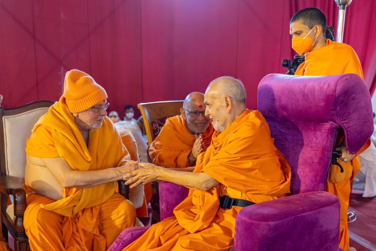 Pujya Ishwarcharan Swami greets Swamishri