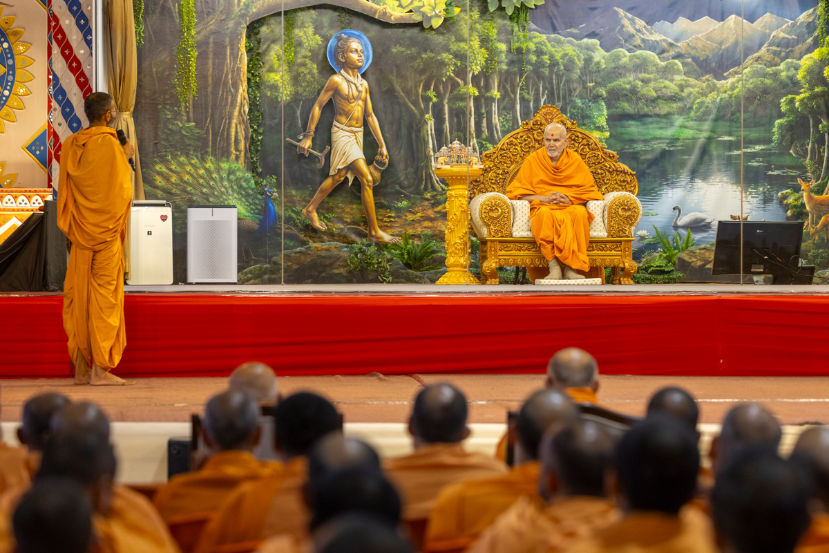 Swamishri listens to Manovijay Swami