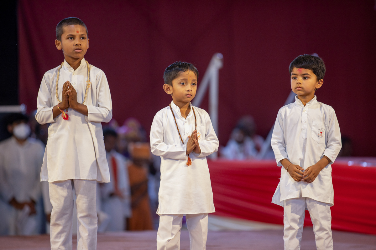 Balaks lead everyone in reciting the sadhana mantra and daily prayer in Swamishri's puja