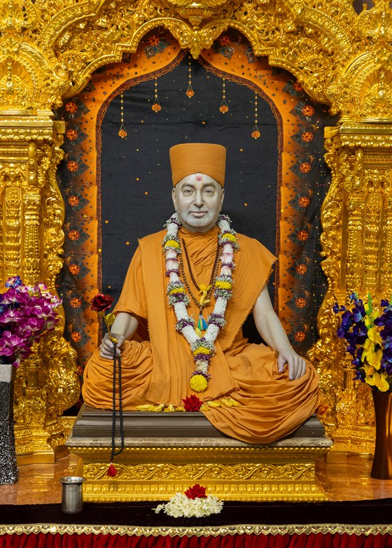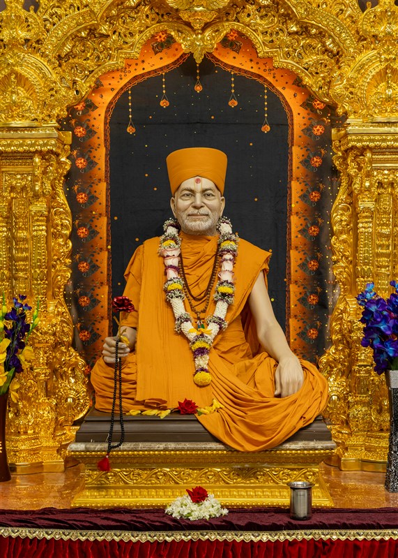 Param Pujya Mahant Swami Maharaj engrossed in darshan of Shri Harikrishna Maharaj and Shri Gunatitanand Swami Maharaj