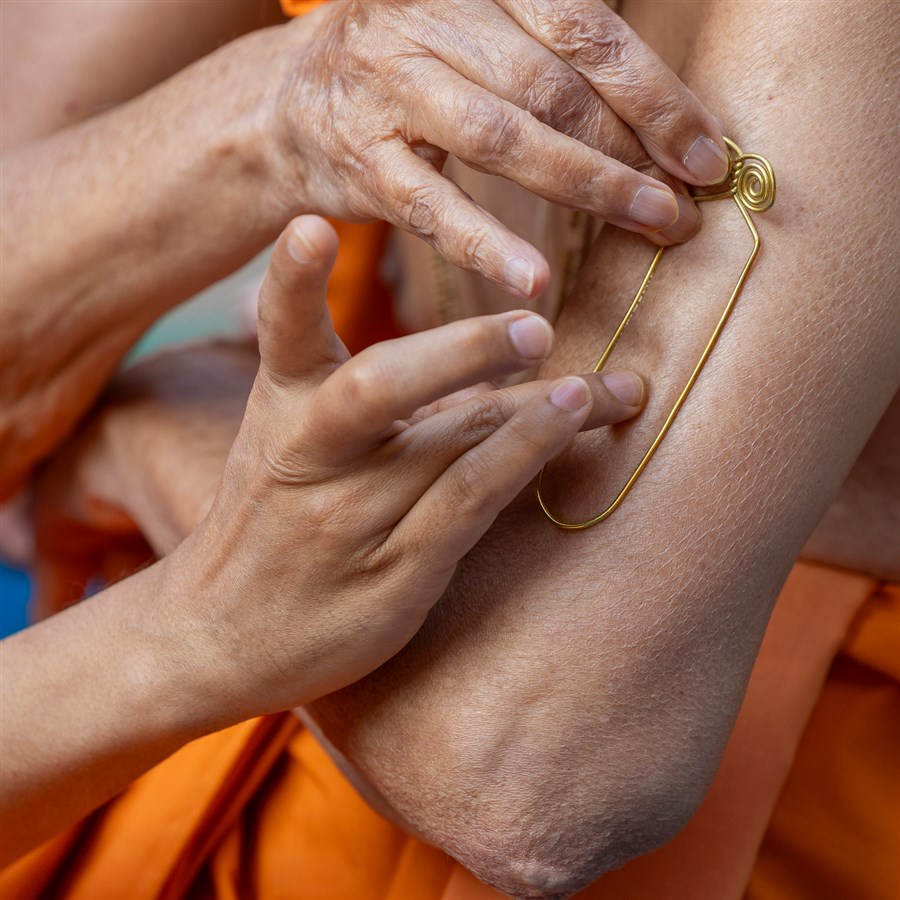 Swamishri applies a tilak on his upper arm