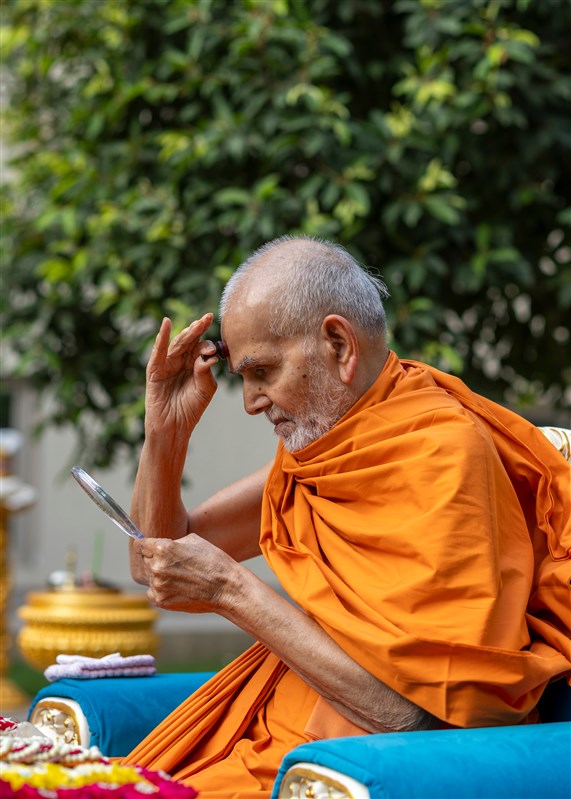 Swamishri applies a tilak on his forehead