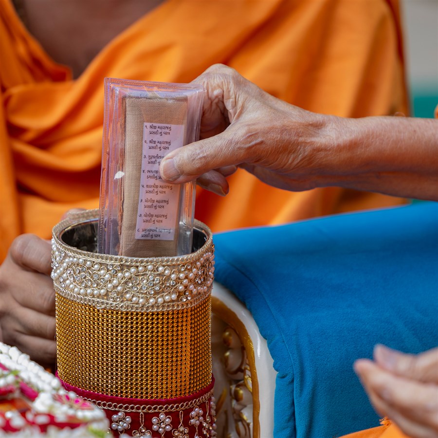 Swamishri sanctifies water with the holy relics of Bhagwan Swaminarayan and the Guru Parampara