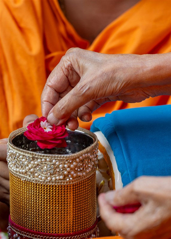 Swamishri adds flowers to the sanctified water