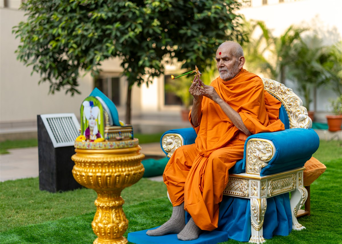 Swamishri performs the morning arti