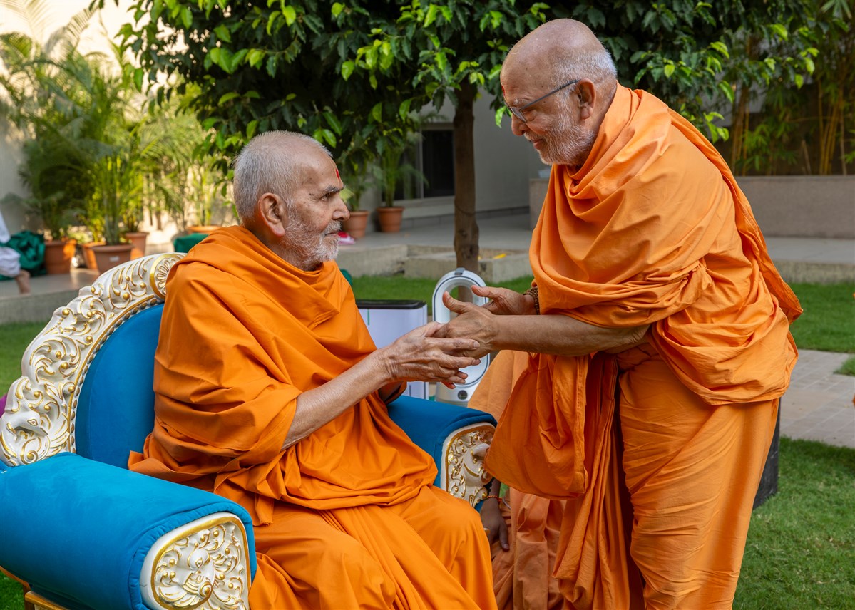 Pujya Ghansnyamcharan Swami greets Swamishri