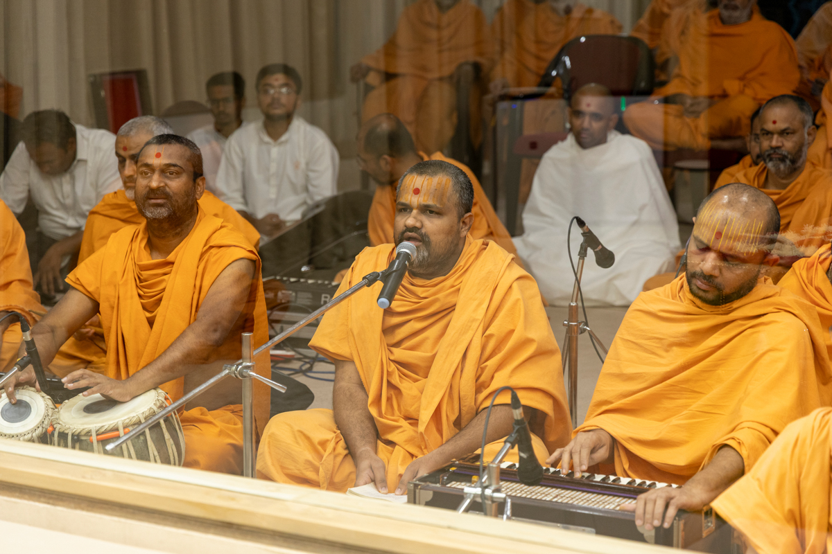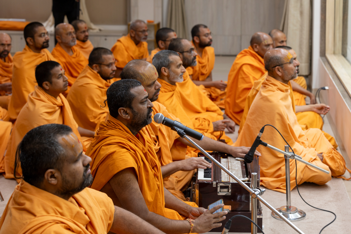 A swami sings a kirtan in Swamishri's daily puja