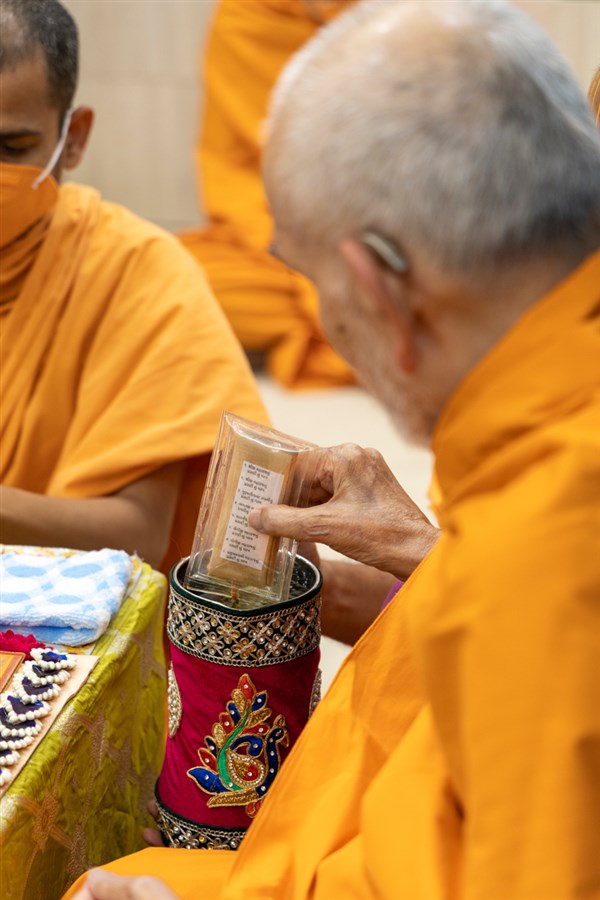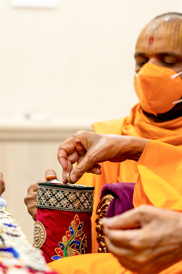 Swamishri sanctifies water with the holy relics of Bhagwan Swaminarayan and the Guru Parampara