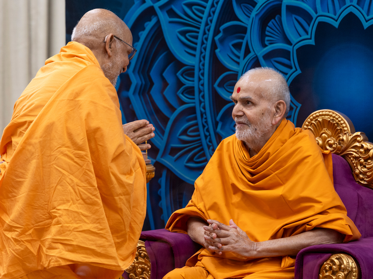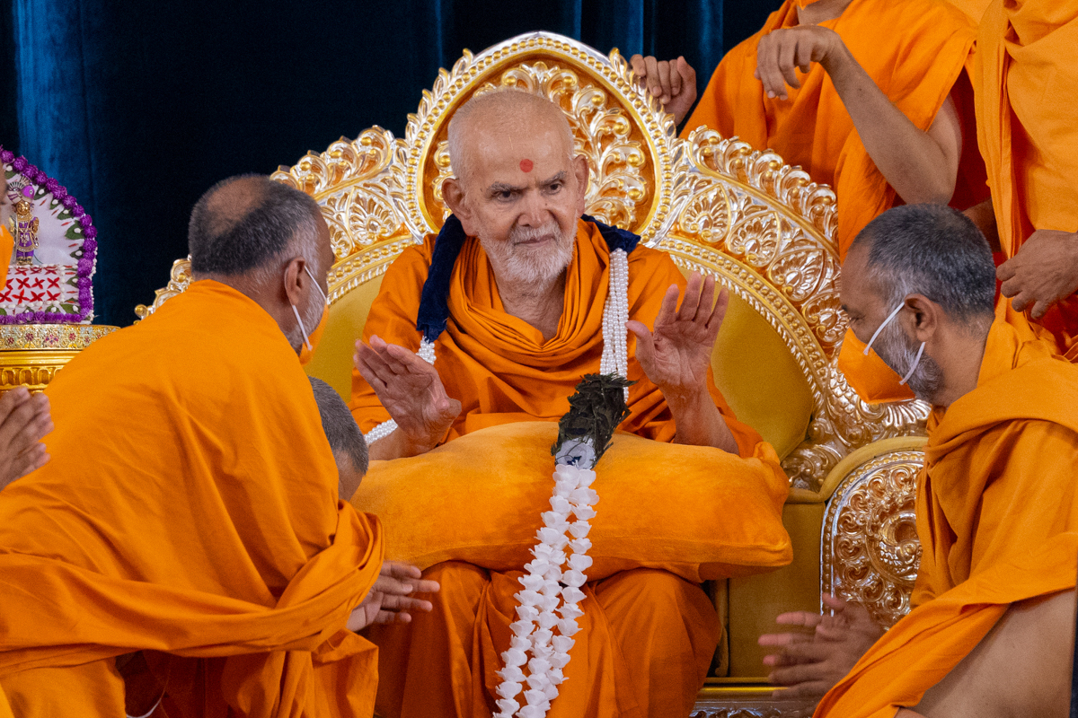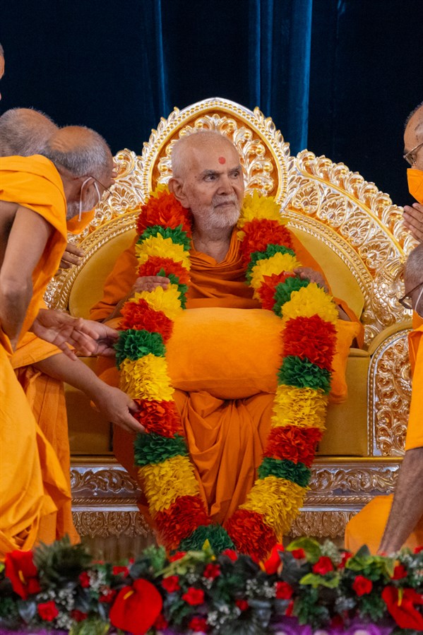 Swamis honor Swamishri with a garland